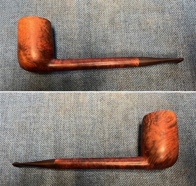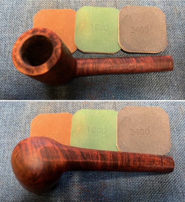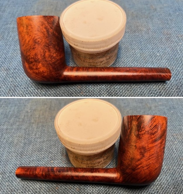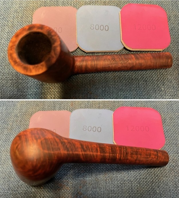 Armed with that information I turned to work on the pipe itself. Jeff had done a great job cleaning up the pipe as usual. He cleaned up the inside of the bowl with a PipNet reamer and a Savinelli Fitsall Pipe Knife. The bowl walls looked very good. He scrubbed the interior of the bowl and shank with pipe cleaners, cotton swabs and alcohol to remove the tars and oils. He scrubbed the exterior of the pipe with Murphy’s Oil Soap and a tooth brush to remove the grime from the finish. He worked on the rim top lava and darkening with the soap and tooth brush. He scrubbed the inside of the stem with alcohol and pipe cleaners. He scrubbed the exterior with Soft Scrub and then soaked it in Briarville’s Pipe Stem Deoxidizer. He washed it off with warm water to remove the deoxidizer. The pipe looked far better. I took photos of the pipe when I received it before I started working on it. I took photos of the bowl and rim top to show how clean it was. The top and the inner edge of the rim show some darkening, nicks and scratches. The stem looks clean of debris and grime. There are tooth marks and chatter on both sides. There are also tooth marks on the underside of the stem.I took photos of the stamping on the top and undersides of the shank. The stamping is clear and readable (though fainter on the underside). I took a photo of the pipe with the stem removed to show the overall look of stem, tenon and profile of the pipe.I started my work on the pipe by addressing the damage on the inner edge of the rim. I used a folded piece of 220 grit sandpaper to smooth out the roughness. I then used 220 grit sandpaper and a wooden ball to give the inner edge of the bowl a slight bevel. It looked much better at this point in the process.I sanded the briar rim top and the sides of the bowl with 320-3500 grit sanding pads. I wiped the bowl down with a damp cloth after each pad. By the time I finished with the 3500 grit pad the briar had taken on a rich glow. I polished the briar bowl and shank with micromesh sanding pads – dry sanding with 1500-12000 grit sanding pads. I wiped it down with a damp cloth after each pad to remove the debris. The bowl took on a rich glow. I rubbed the bowl down with Before & After Restoration Balm. I worked it into the surface of the briar with my fingertips and a horsehair shoe brush to clean, enliven and protect it. I let the balm sit for 10 minutes and then buffed with a cotton cloth and shoe brush to raise the shine. Mark Hoover’s Balm is a product that I have come to appreciate and one I use on every pipe I have been working on. I set aside the bowl and turned my attention to the stem issues. I “painted” the surface of the stem to try and lift the tooth marks on the top and underside of the stem just ahead of the button. I was able to lift them to some degree but a few remained. I filled them in with black CA glue and set it aside to let the repairs cure. Once the repairs cured I used a file to flatten out the repairs and start blending them into the stem. surface. I sanded it with a folded piece of 220 grit sandpaper to begin the process of blending them into the stem surface. I sanded it with 320-3500 grit sanding pads to further blend them in and smooth out the surface of the stem.I polished the vulcanite with micromesh sanding pads – 1500-12000 grit pads. I wiped it down with a damp cloth after each sanding pad. I used Before & After Pipe Polish – both Fine and Extra Fine to further polish the stem. I put the stem back on the Fischer Deluxe Long Canadian and took it to the buffer. I worked it over with Blue Diamond to polish out the remaining small scratches. I gave the bowl and the stem several coats of carnauba wax and buffed the pipe with a clean buffing pad to raise the shine. I hand buffed it with a microfiber cloth to deepen the shine. The pipe polished up really well and the bevelled rim top looked good. I was happy with the look of the finished pipe. The photos below show what the pipe looks like after the restoration. This Long Shank Tall Canadian is a beautiful and unique take on a classic shape. The polished vulcanite taper stem looks really good with the browns of the briar. The dimensions of the pipe are Length: 7 inches, Height: 2 ¼ inches, Outside diameter of the bowl: 1 ¼ inches, Chamber diameter: 7/8 of an inch. The weight of the pipe is 1.80 ounces/51 grams. This is another pipe that I will be putting it on the rebornpipes store in the American Pipe Makers Section shortly, if you are interested in adding it to your collection. The long shank and tall bowl look and feel great in the hand. This one should be a great smoker. Thanks for walking through the restoration with me on this beauty!