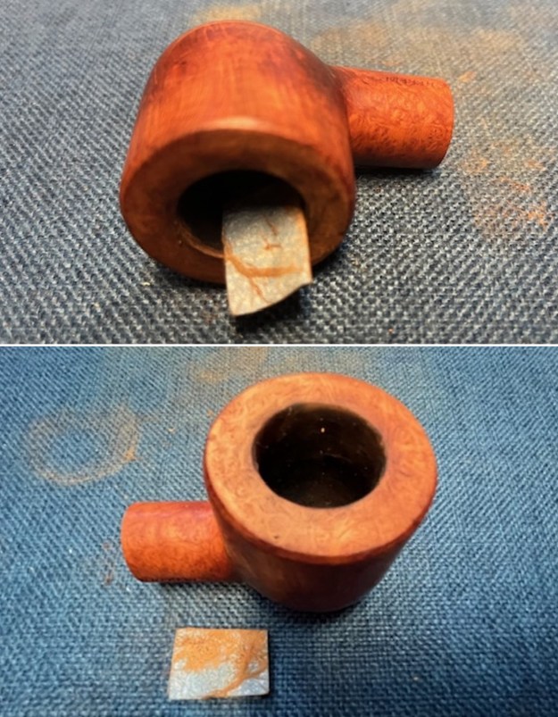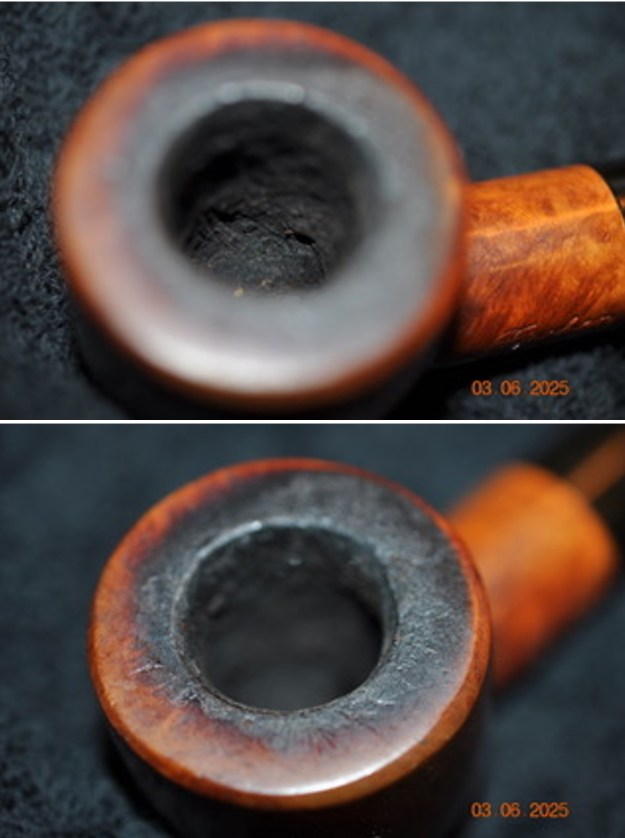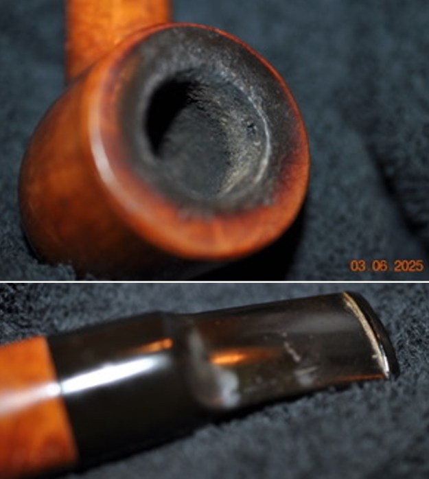 Armed with that information I turned to work on the pipe itself. Jeff had done a great job cleaning up the pipe as usual. He cleaned up the inside of the bowl with a PipNet reamer and a Savinelli Fitsall Pipe Knife. The bowl walls looked very good. He scrubbed the interior of the bowl and shank with pipe cleaners, cotton swabs and alcohol to remove the tars and oils. He scrubbed the exterior of the pipe with Murphy’s Oil Soap and a tooth brush to remove the grime from the finish. He worked on the rim top lava and darkening with the soap and tooth brush. He scrubbed the inside of the stem with alcohol and pipe cleaners. He scrubbed the exterior with Soft Scrub and then soaked it in Briarville’s Pipe Stem Deoxidizer. He washed it off with warm water to remove the deoxidizer. The pipe looked far better. I took photos of the pipe when I received it before I started working on it.