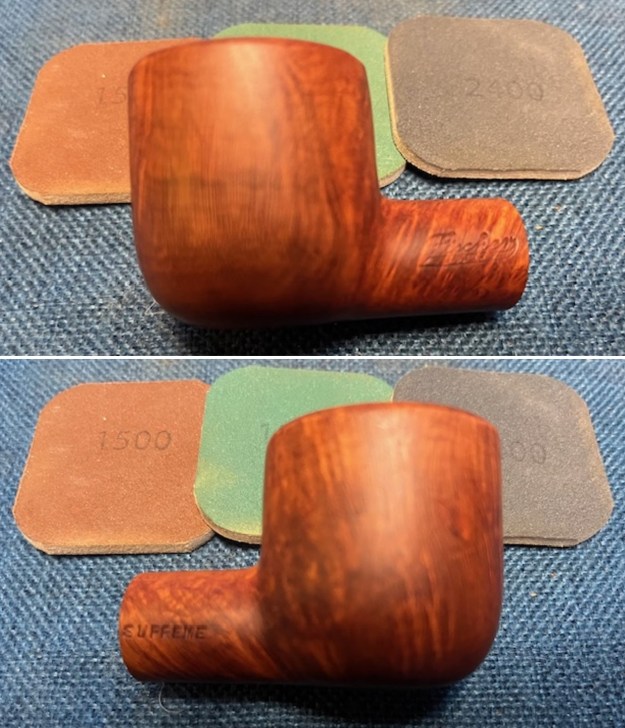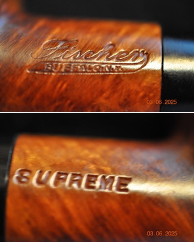 The next pipe on the table is one that we picked up from a seller in Harrison Township, Michigan, USA on 08/22/2024. The smooth finish, the grain around the bowl sides and rim top along with the stamping on the shank is what caught our eye. It is stamped on the left side of the shank and reads Fischer [over] Buffalo, N. Y. On the right side it is stamped Supreme. It is a short stubby Pot shaped pipe that I have called a short snorter or nose warmer. The bowl a thick cake and the inner edge and the top show some thick lava overflow. The stem is lightly oxidized and there are some light tooth marks and chatter on the top and underside ahead of the button and on the button surface. Jeff took some photos of the pipe to show the general condition of the pipe before he started his clean up.