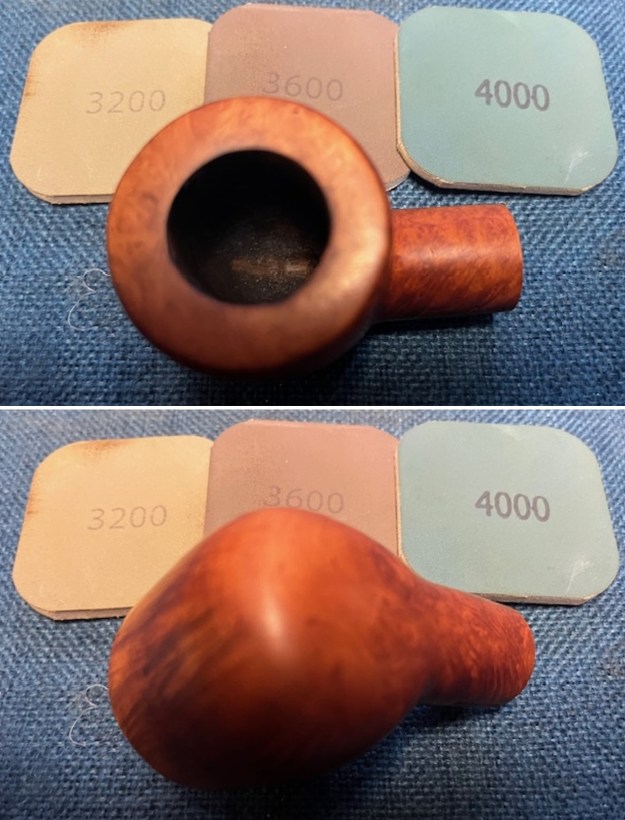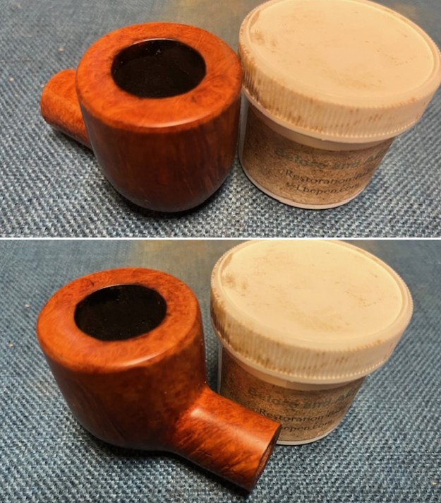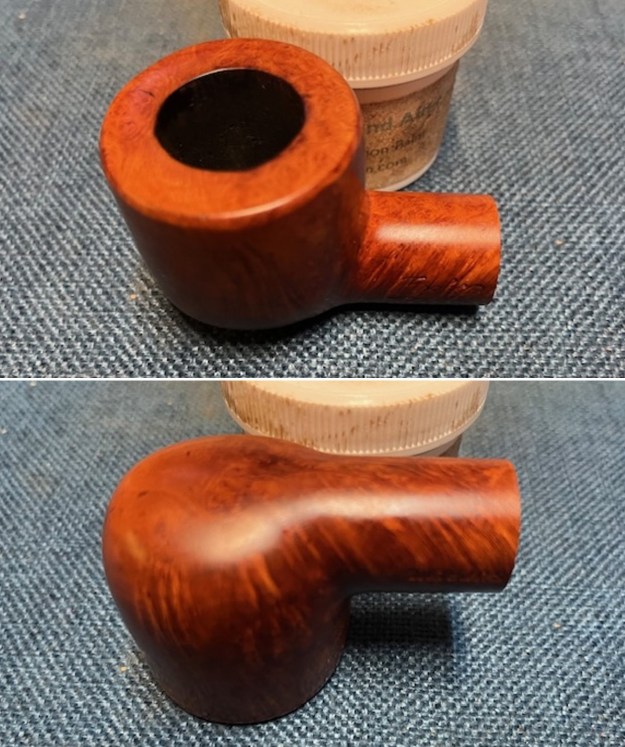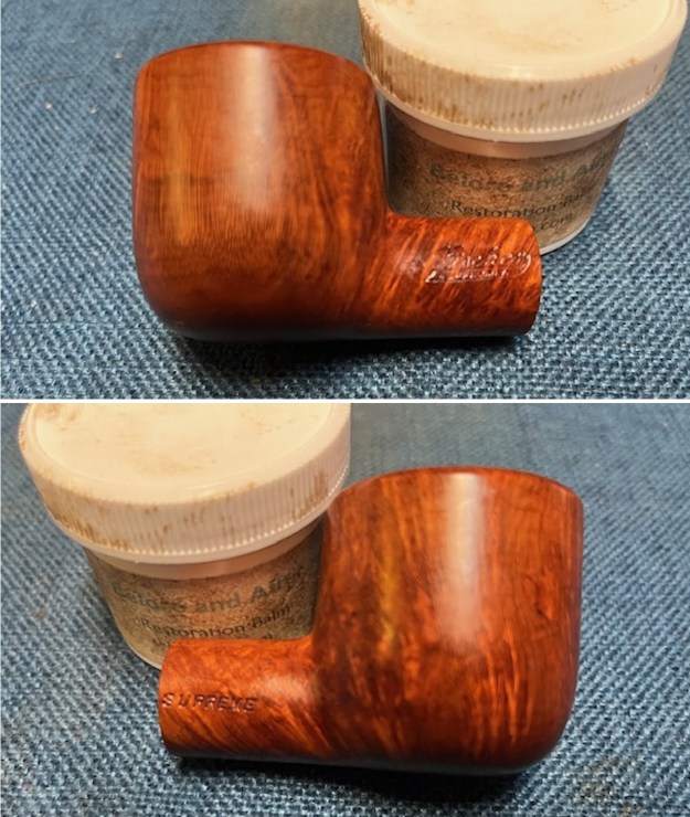I rubbed the bowl down with Before & After Restoration Balm working it into the briar with my fingertips and a horsehair shoe brush to clean, enliven and protect it. I let the balm sit for 15 minutes and then buffed with a cotton cloth to raise the shine. Mark Hoover’s Balm is a product that I have come to appreciate and one I use on every pipe I have been working on.