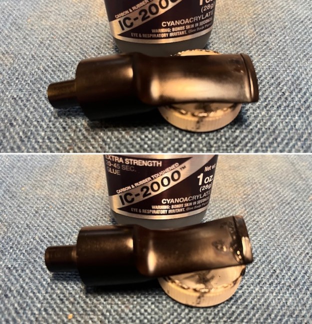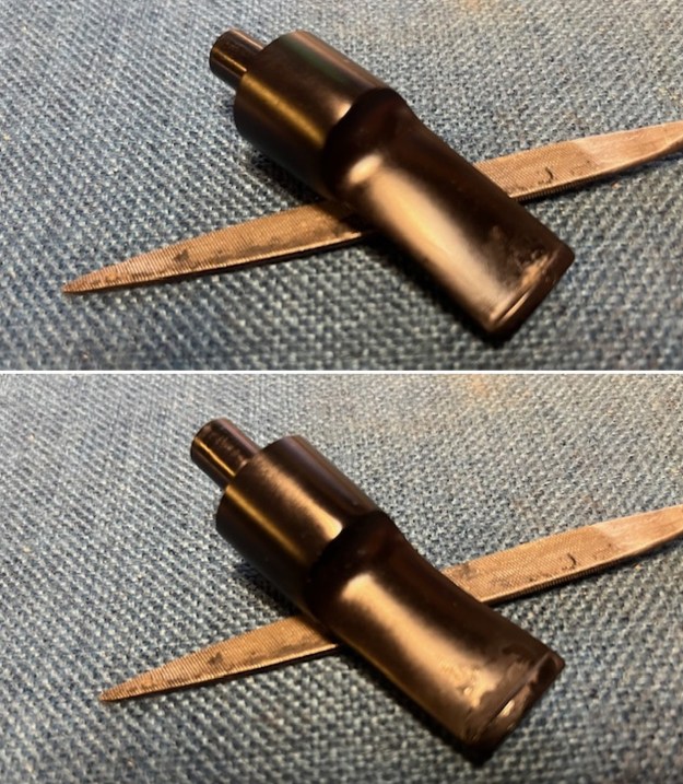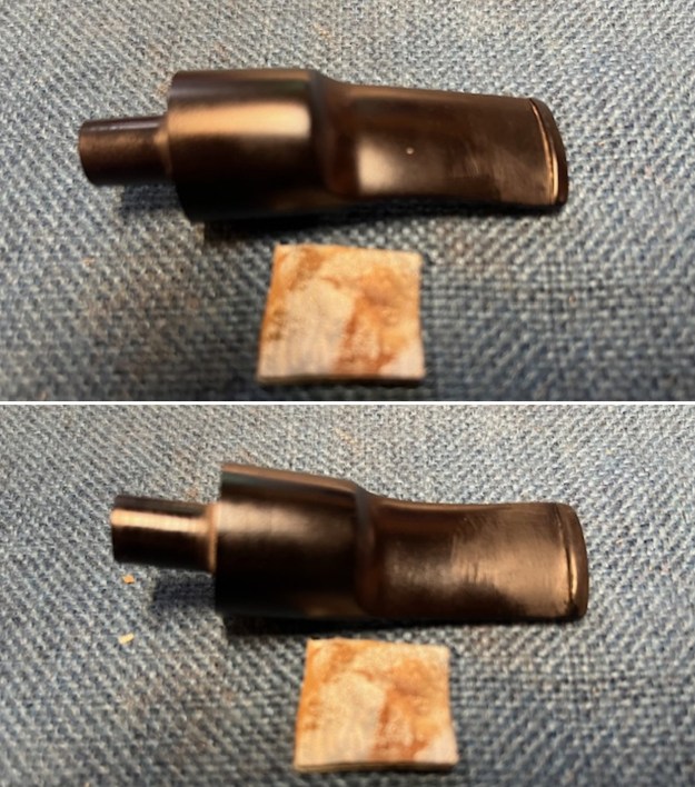 I set the bowl aside and turned to the stem. I “painted” the surface with the flame of a lighter to lift the tooth marks on the stem and button surface. I was able to lift many of them. I filled in the remaining marks on the button and stem with rubberized black CA glue. Once it cured I use a small file to flatten the repairs. I sanded it smooth with a folded piece of 220 grit sandpaper.