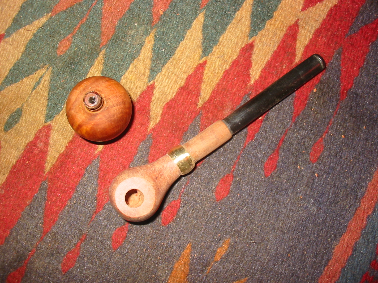 With the bowl finished and the stain cured it was time to press the band in place. I gave it a thin layer of white all purpose glue on the inside of the band and pressed it onto the shank end. It looks quite fetching to me. I set it aside to let the glue cure but I like it!