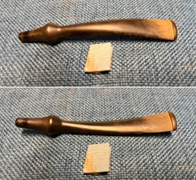 What to do next? I figured I might as well continue working on the stem since I had already started. I sanded out the tooth chatter on the stem end and worked on the oxidation with a folded piece of 220 grit sandpaper.