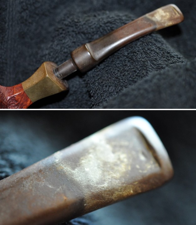 I tried to capture the stamping on the shank underside. It is a bit blurry but it is still very readable and clear as noted above. I took a photo of the pipe with the replacement stem removed. It really makes it clear to me that it is a replacement.