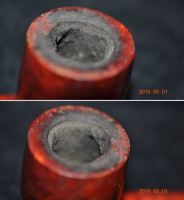 I took photos of the rim top and the stem to show the condition. You can see the thick cake in the bowl and overflow of lava on the rim top. The photos of the stem show the light tooth chatter on the vulcanite on the top and underside ahead of the button.