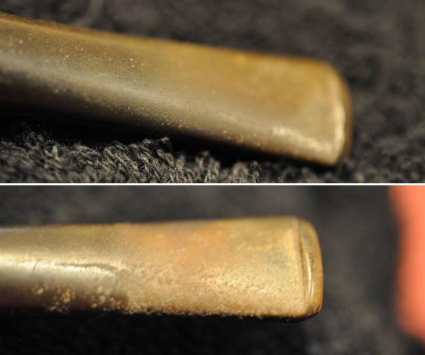 I cleaned up the buildup on the inner edge with a piece of sandpaper. I sanded the top of the rim with the piece of 220 grit sandpaper and was able to remove the darkening.
