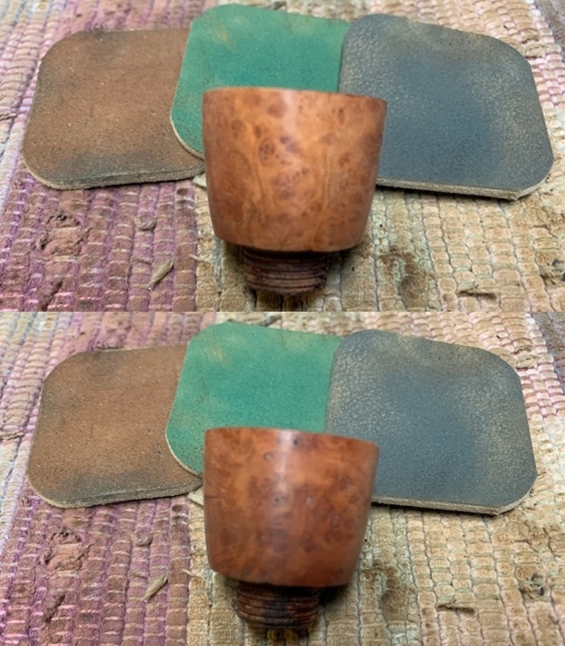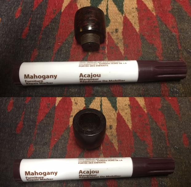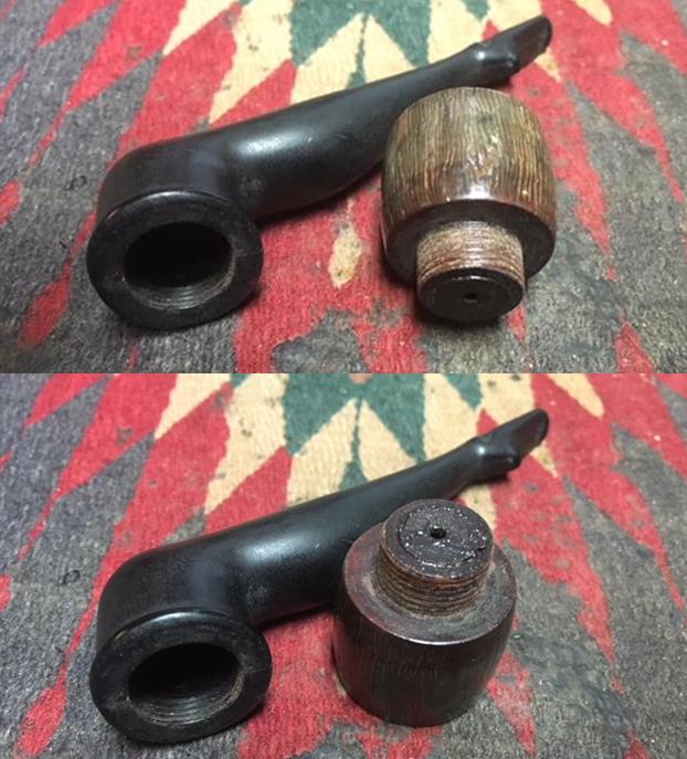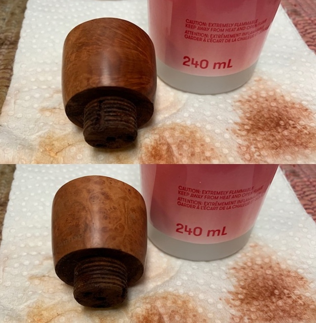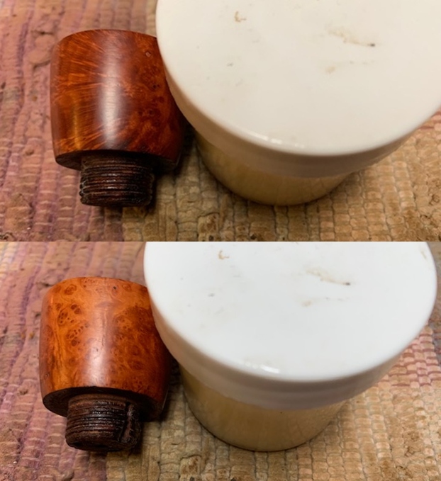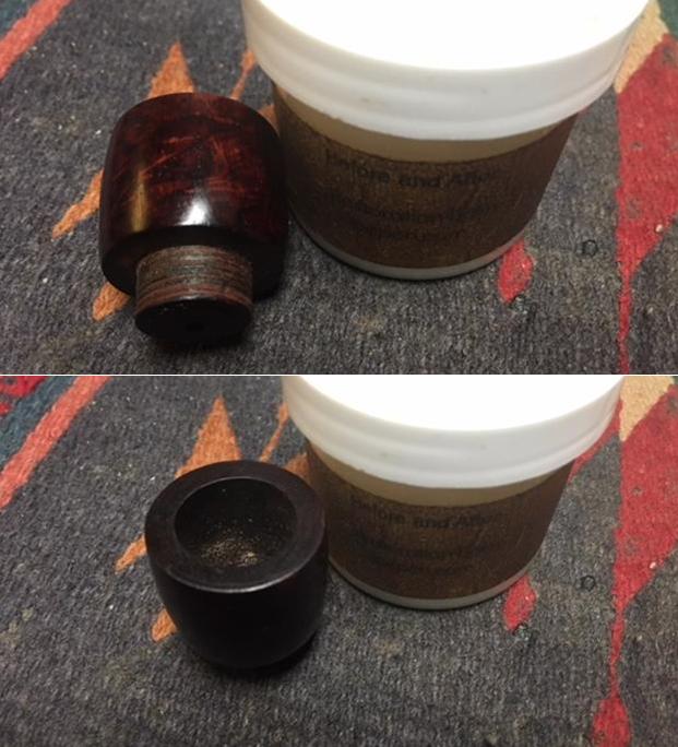 I wiped the bowl down with acetone to remove the varnish coat from the briar. The briar looked much better without the shiny coat. I wiped down the threads with acetone as well to remove the grit in the threads.