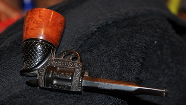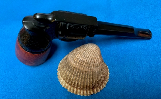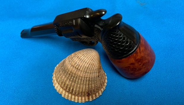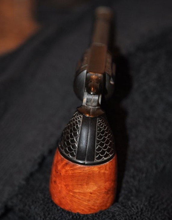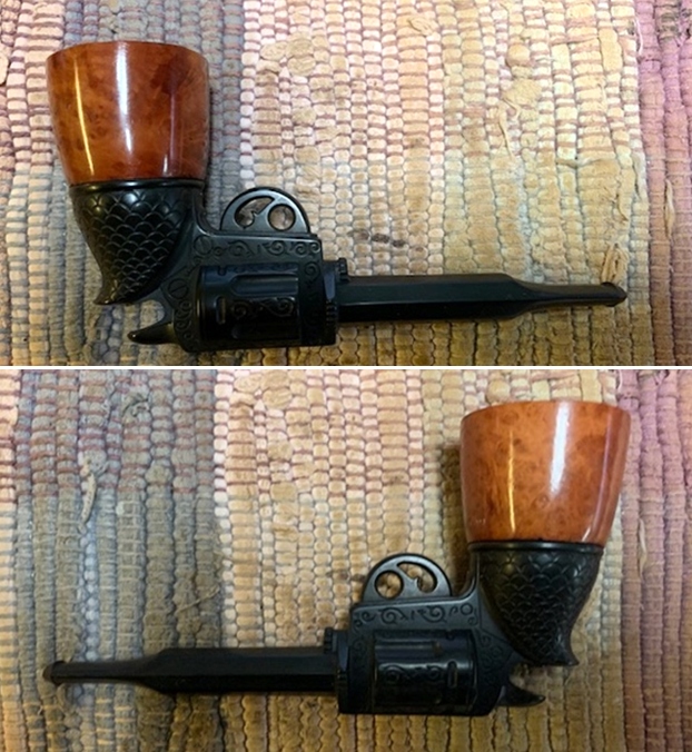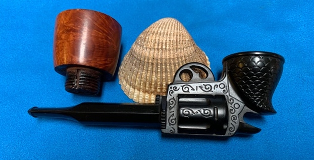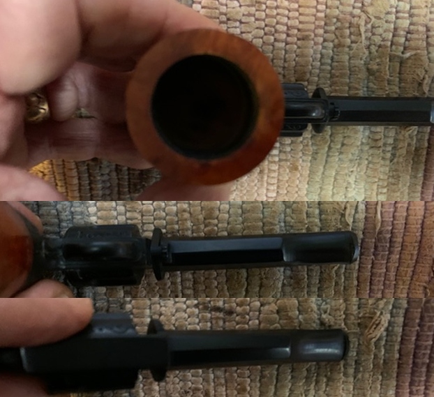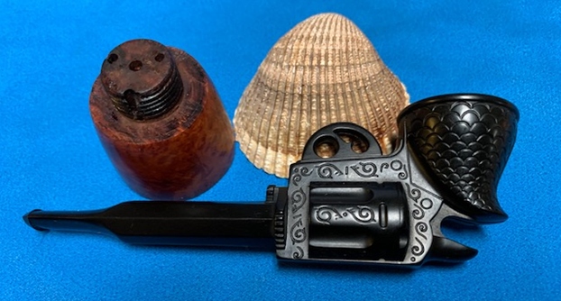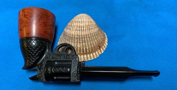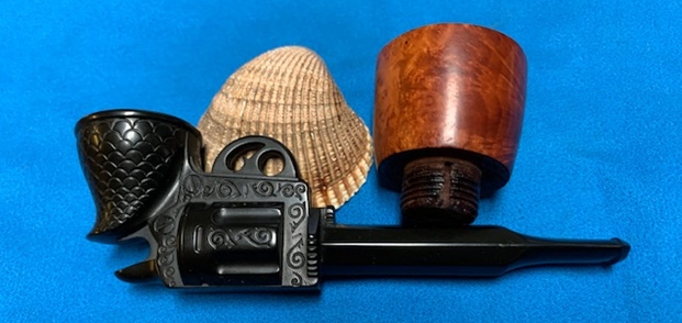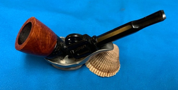 This Gutta-percha and Briar Bowled Revolver with a barrel shaped like a gun barrel is a great looking pipe now that it has been restored. I put the bowl back on the base and carefully buffed the pipe with Blue Diamond on the buffing wheel using a light touch on the briar. I gave the bowl multiple coats of carnauba wax on the buffing wheel and followed that by buffing the bowl with a clean buffing pad. I hand buffed the pipe with a microfiber cloth to deepen the shine. The finished Revolver Shaped Pipe fits nicely in the hand and feels great. Give the finished pipe a look in the photos below. The dimensions of the pipe are Length: 5 inches, Height: 2 ½ inches, Outside diameter of the bowl: 1 ½ inches, Chamber diameter: 7/8 of an inch. The weight of this pipe is 33g/1.16oz. Thanks for reading this blog and my reflections on the pipe while I worked on it. There are many more to come!