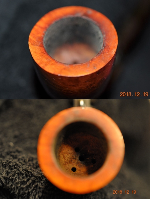 He took photos of the rim top and bowl to give a clear picture of the thickness of the cake on the top half of the bowl. There were spots of lava on the rim top. The varnish coat was also peeling and blistering. He also took photos of the barrel or shank of the pipe to show the sticky substance all around it. The top and underside of the stem show chatter and tooth marks.