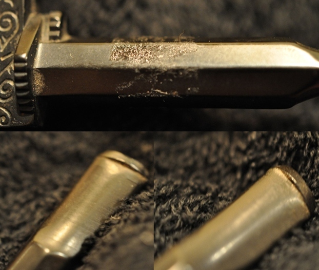 The next pipe on the table came to us from one of Jeff’s pipe hunts on the Oregon Coast. Over the past year or so we have picked up several of these. It is an interesting pipe in that the base is shaped like a revolver pistol and made out of gutta-percha while the handle of the pistol is made from briar. It is threaded and screws into the base of the bowl. The bowl has three air holes in the bottom of the bowl surrounding a larger centre hole. To me it seems a bit of an oddity to put the barrel of the gun into your mouth and suck on the smoke but then, to each his/her own I guess. This one had definitely been smoked. While the bottom of the bowl was raw briar the top half had some cake on it and some light lava overflow on the rim top. The gutta-percha base had a lot of well carved nooks and crannies that had been filled in with dust and debris. There was also some gummy substance around the middle of the shank/barrel that appeared to be material from a sales label. Jeff took photos of the pipe before he started his cleanup work.