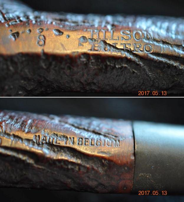 He took photos of the stamping on the underside of the shank. It is stamped as noted above. The vulcanite stem shows a Hilson “H” stamp on the topside of the taper. What stands out for you in the photos of the stamping? What do you look for in the stamping? It is dirty but what do you see underneath the grime on the surface of the briar?