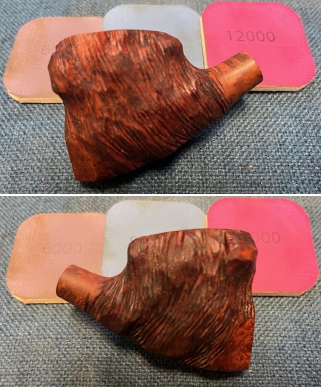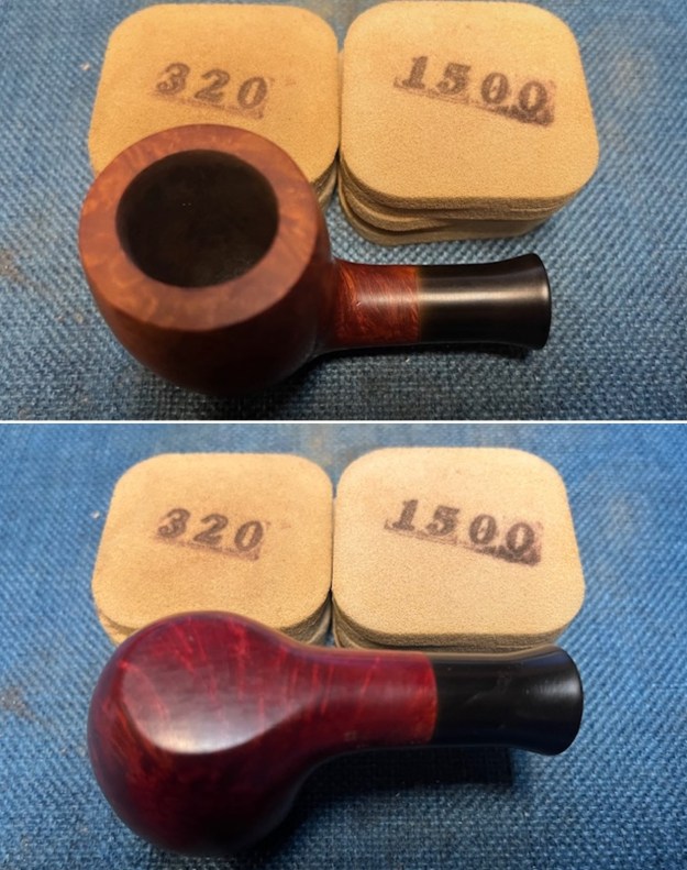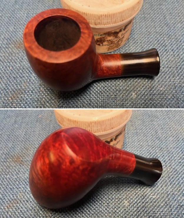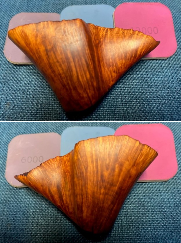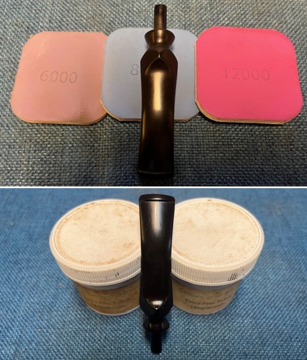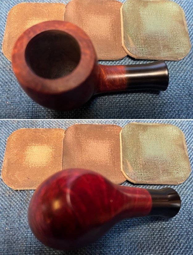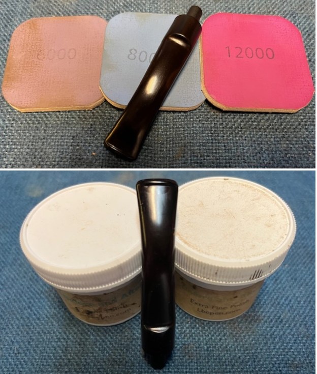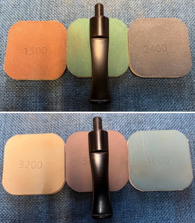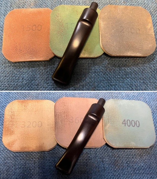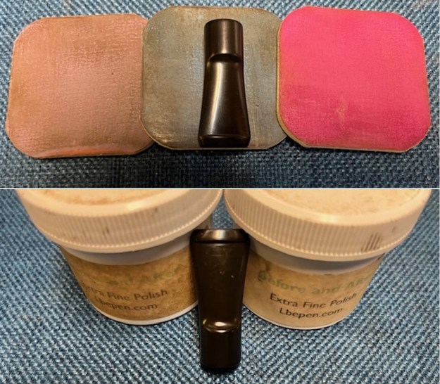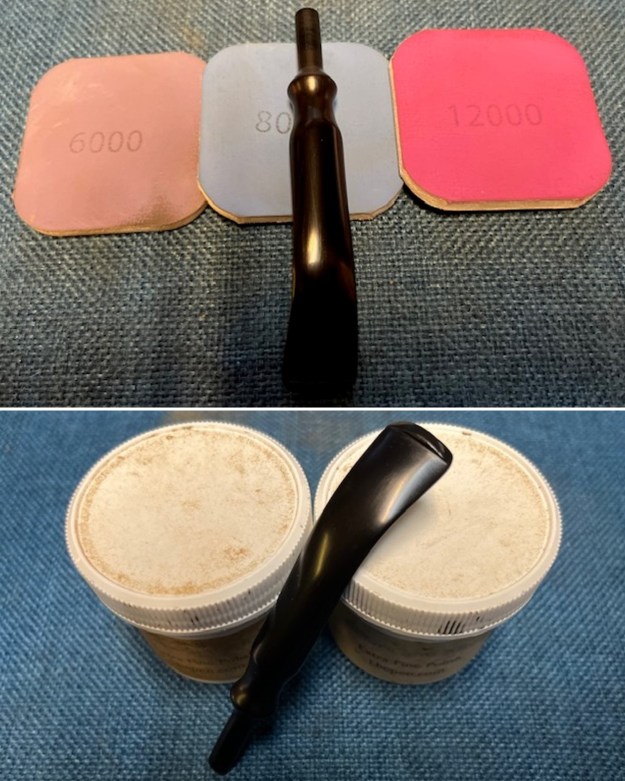 I polished the vulcanite with micromesh sanding pads – 1500-12000 grit pads. I wiped it down with Obsidian Oil after each sanding pad. I used Before & After Pipe Polish – both Fine and Extra Fine to further polish the stem.