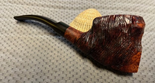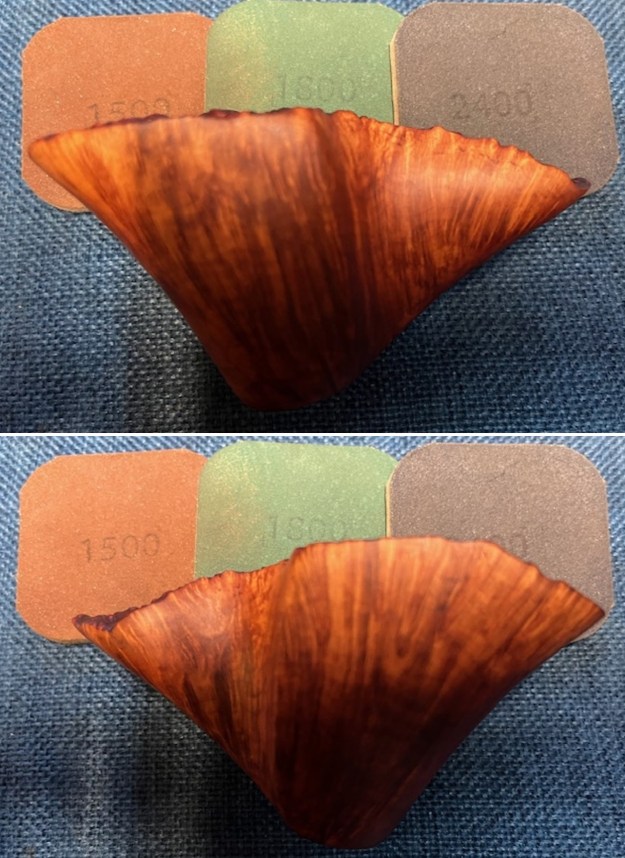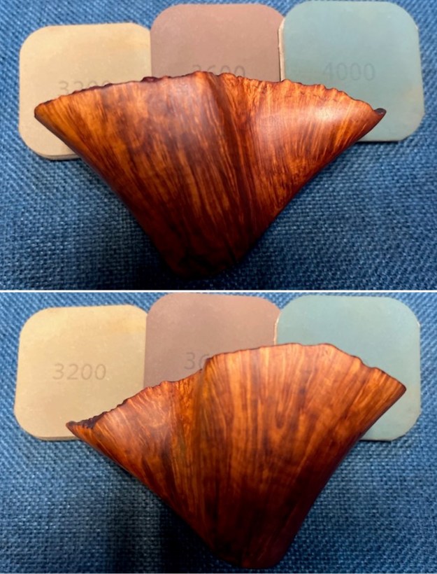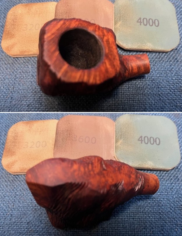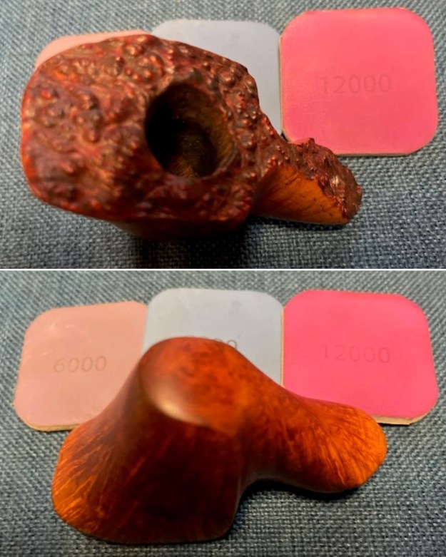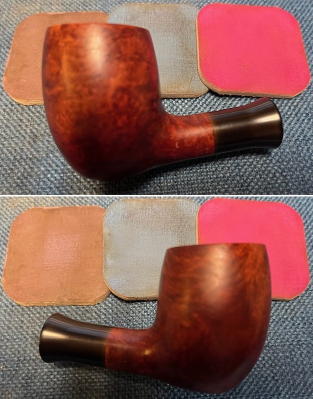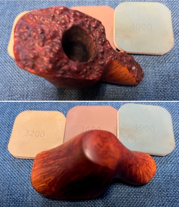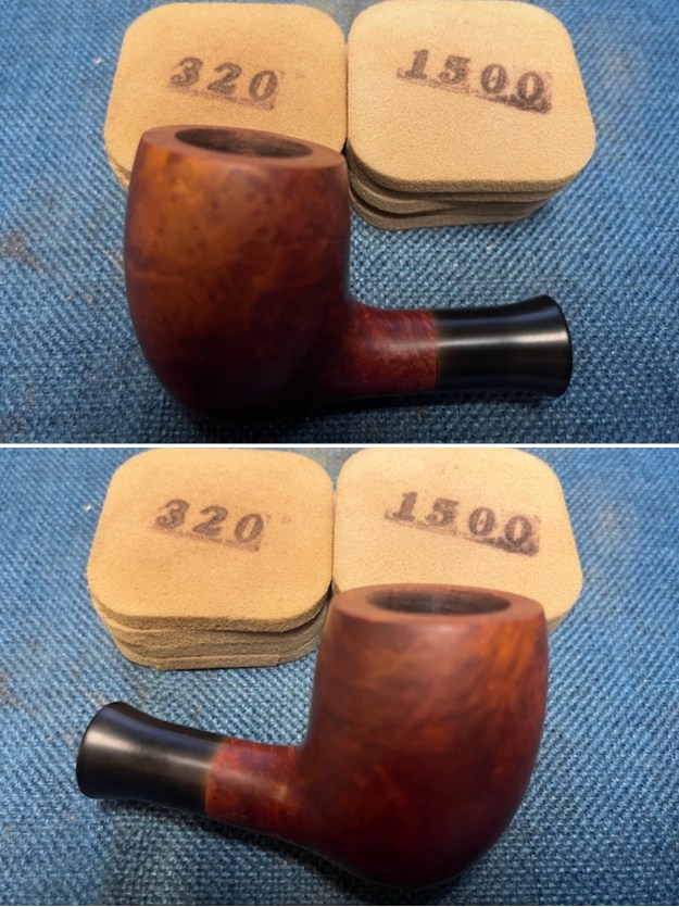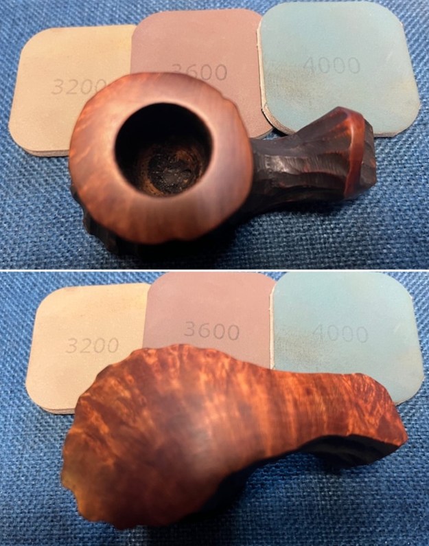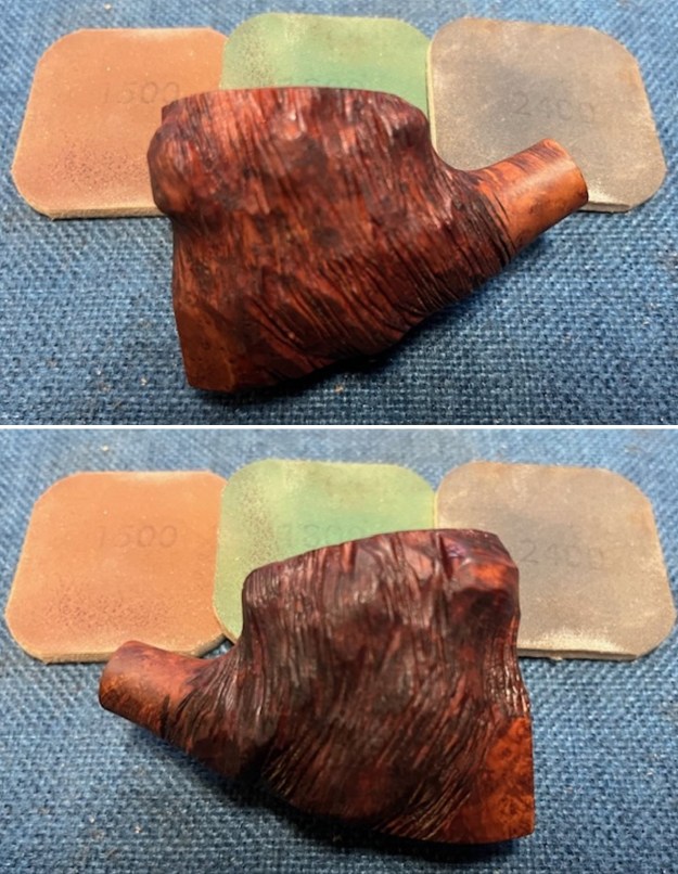 I polished the vulcanite with micromesh sanding pads – 1500-12000 grit pads. I wiped it down with Obsidian Oil after each sanding pad. I used Before & After Pipe Polish – both Fine and Extra Fine to further polish the stem.