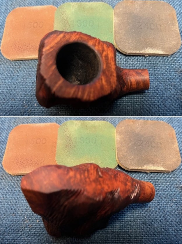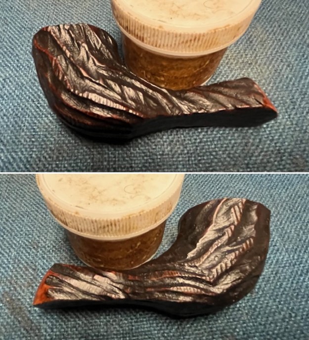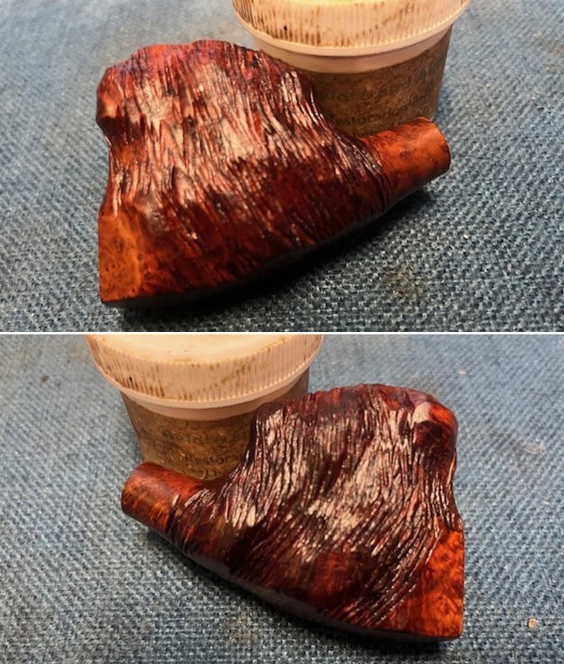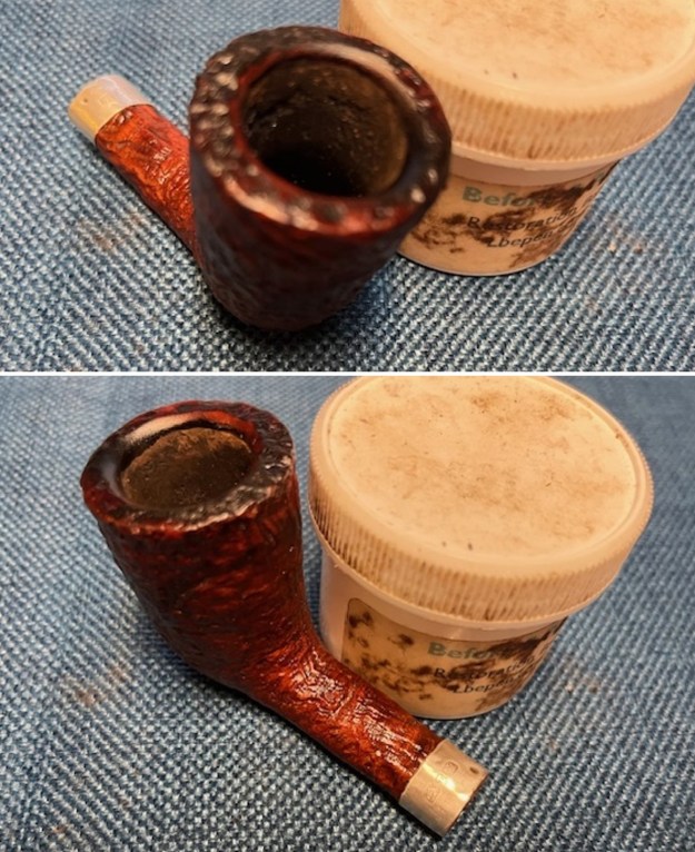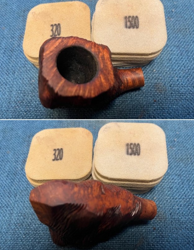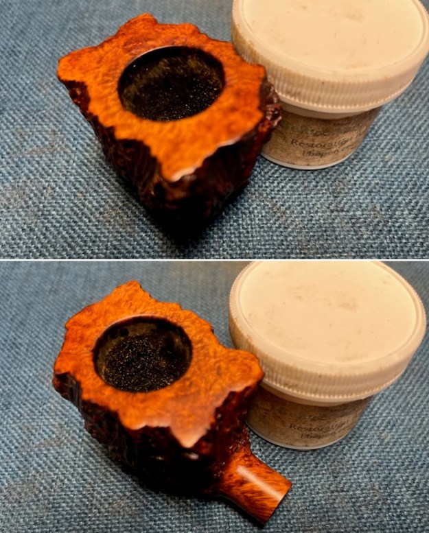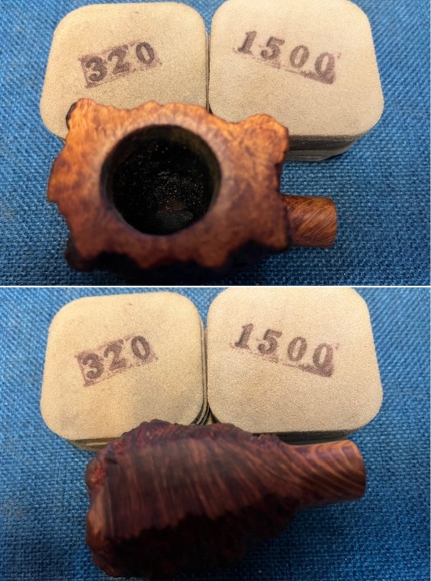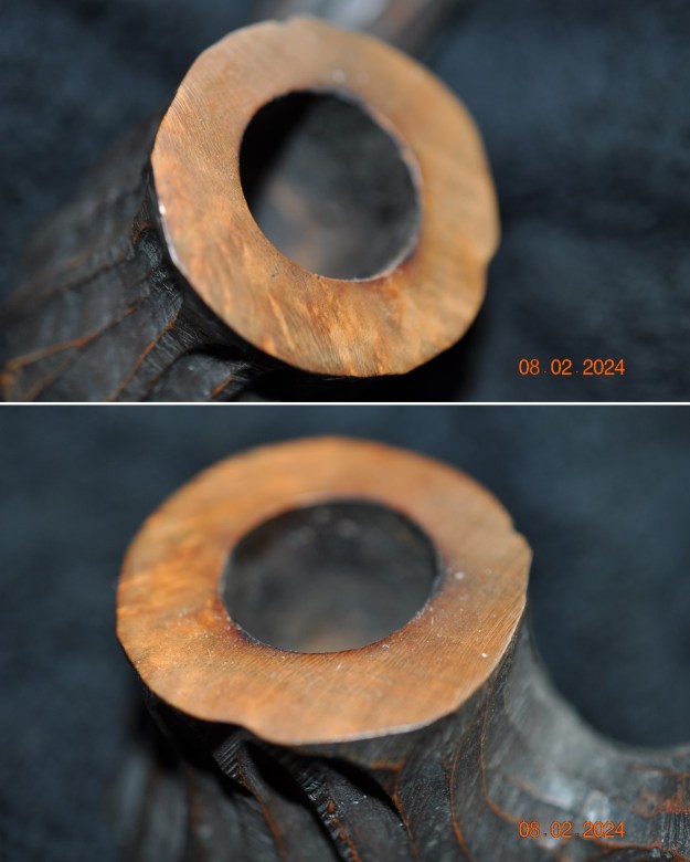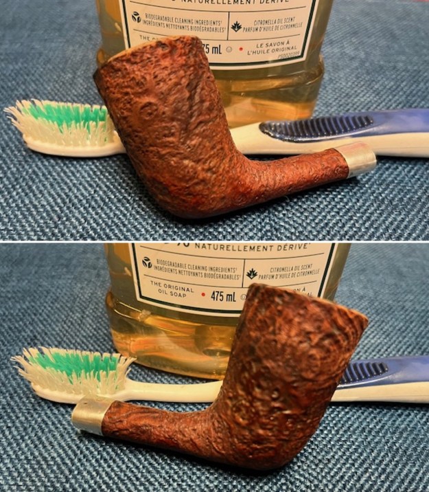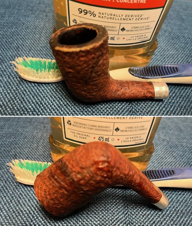 I scrubbed the bowl and shank with a tooth brush and some undiluted Murphy’s Oil Soap. I rinsed it off with warm water to remove the dust and soap from the finish. I dried it off with a soft cloth. The rim top was still darkened in the grooves of the sandblast.