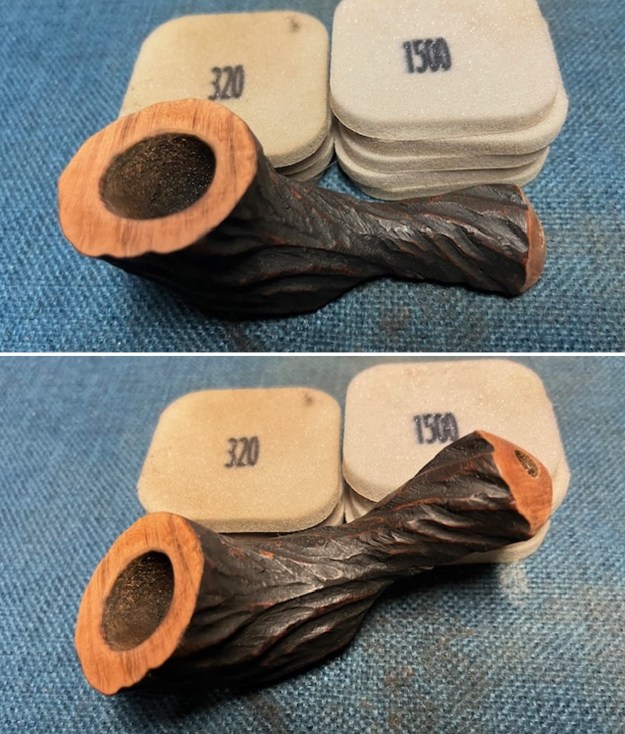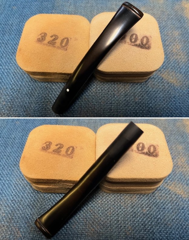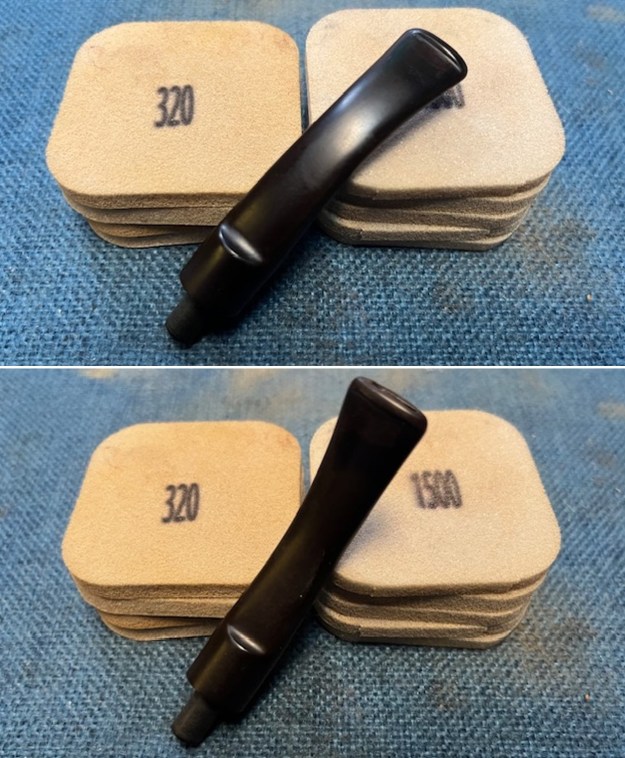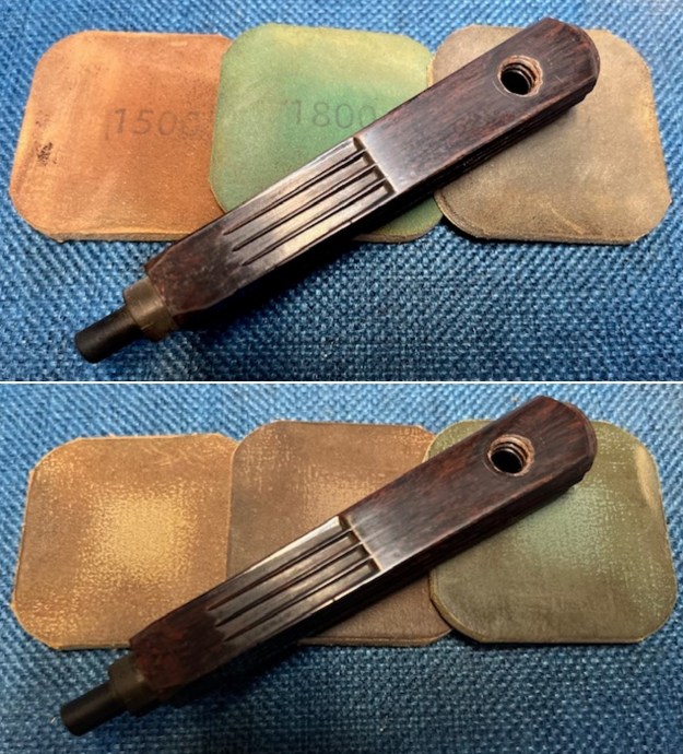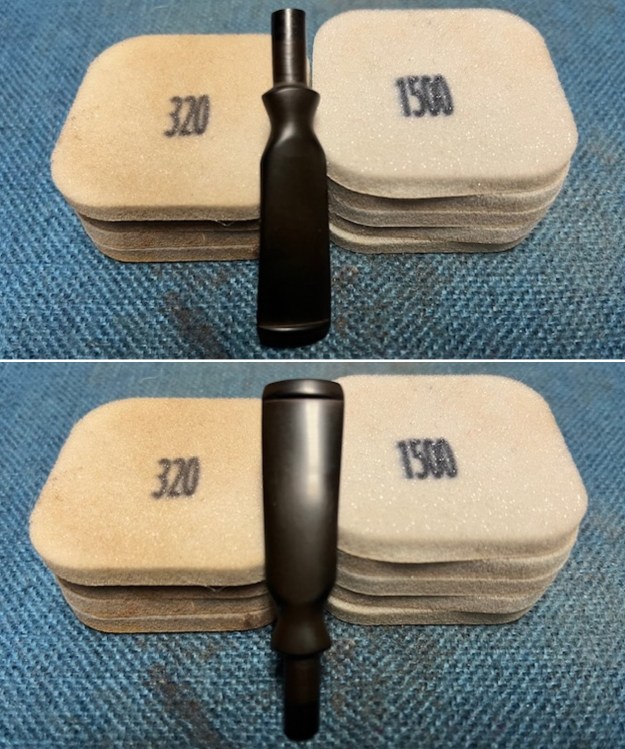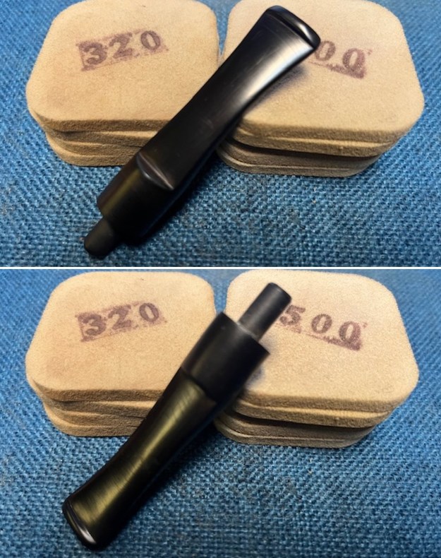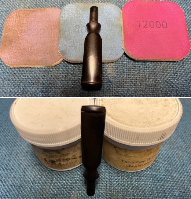 I sanded the stem and tenon surface with 320-3500 grit 2×2 inch pads. I wiped the stem down with an Obsidian Oil cloth after each sanding pad.