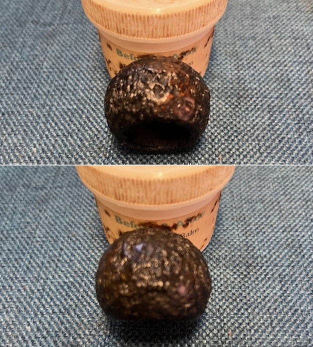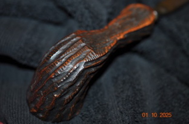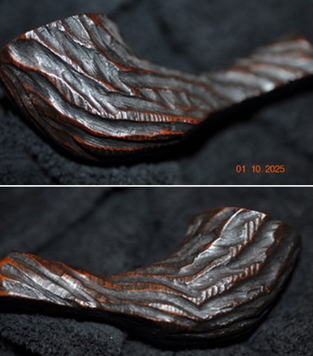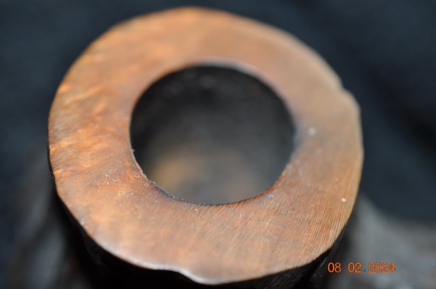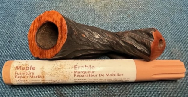 I touched up the black of the flume finish on the rim top and outer edge of the bowl with a black stain pen. It looked much better at this point with the finish cleaned of the dust and debris in the finish. It is a rich and rugged rustication.