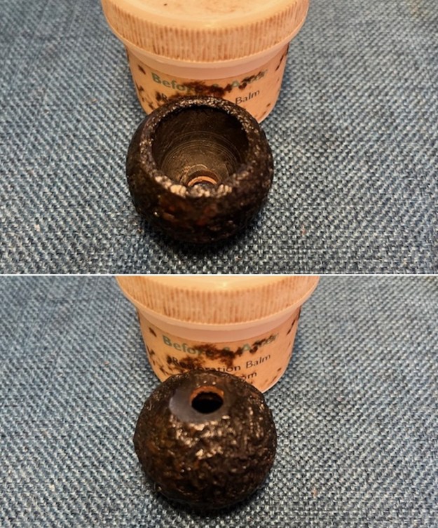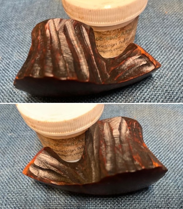 I rubbed the briar down with Before & After Restoration Balm. I worked it into the briar with my fingertips and a horsehair shoe brush to work it into the nooks and crannies of the sandblast finish. The product works to clean, enliven and preserve the briar. I let it sit for 10 minutes then I buffed it with a cotton cloth to deepen the shine. The briar really comes alive with the balm.