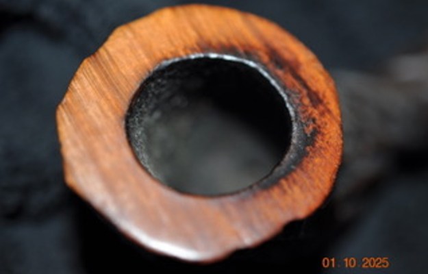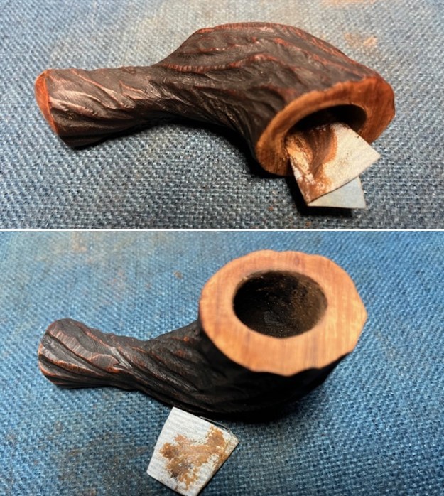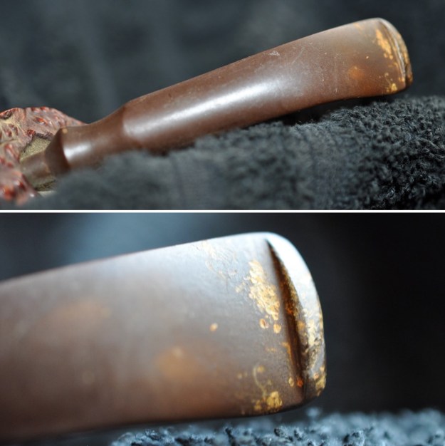 Now it was time to work on the pipe. I started my work by reaming the pipe. I scraped out the light cake with a Savinelli Fitsall Pipe Knife. I took the cake back to bare briar. I sanded the walls smooth with 220 grit sandpaper wrapped around a piece of dowel. The bowl walls looked very good with no burn damage or checking on the walls.