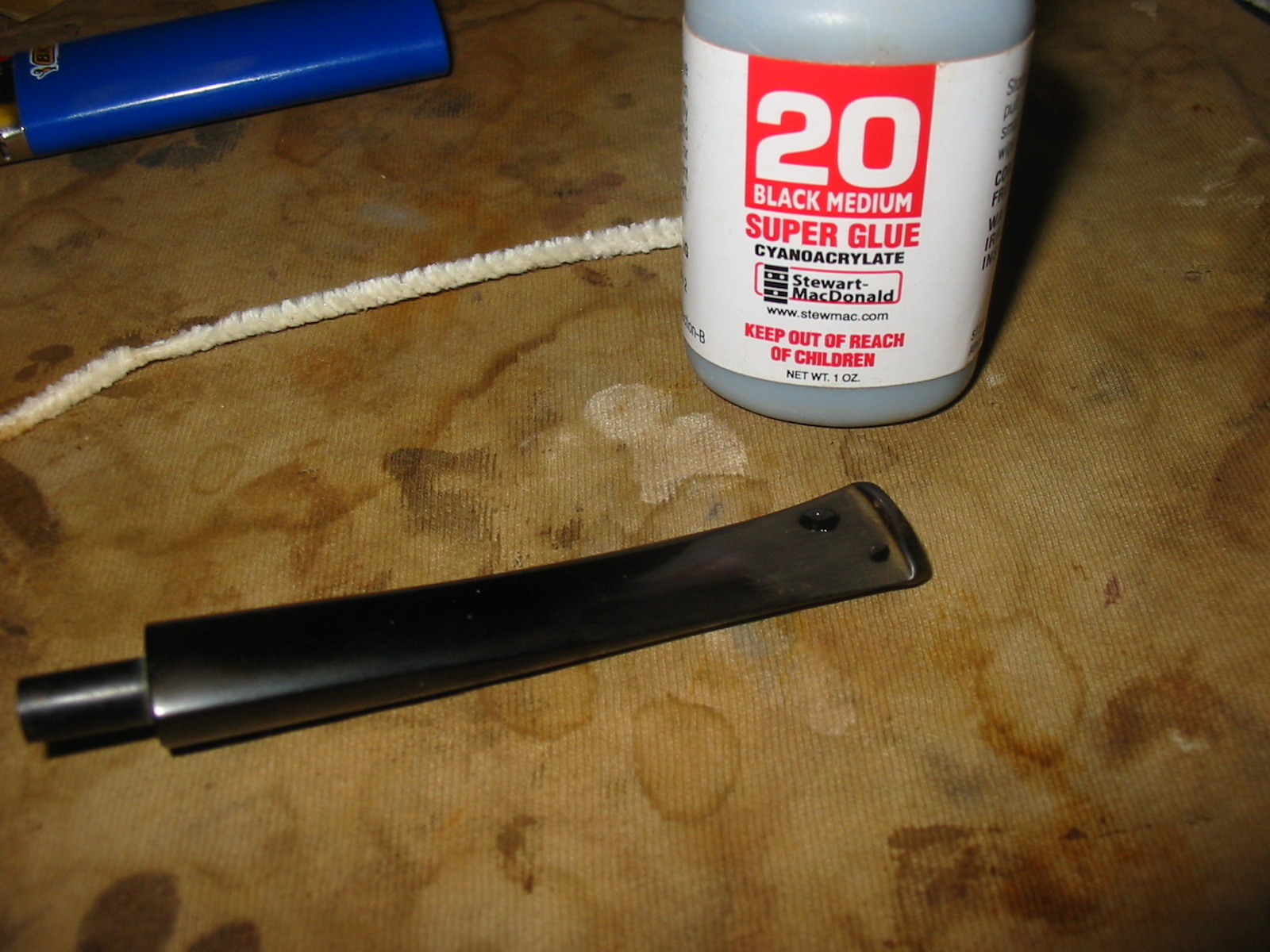 It was ready for the next step. I used a folded piece of 220 grit sandpaper to sand out the poorly done repair on the underside of the stem. I flattened it out and cleaned off the surface of the stem. I filled in the area with black CA glue put in place with a tooth pick. I set it aside to cure.