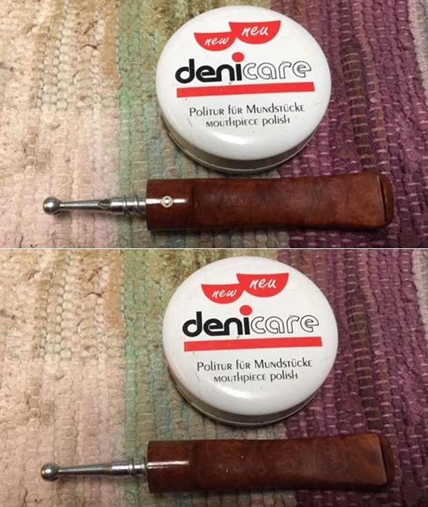 500 and 600 series were that they were cheaper, low-end pipes that ran through the period: 1959 – 1967.  It’s probable that Paw’s Kaywoodie “500” Round Shank Bulldog which isolates it as a “500” that was marketed between 60 to 63, cost him $5.95.  The 1962 Kaywoodie catalog page that Bill Feuerbach provided to include in the restoration write-up of Paw’s Kaywoodie Natural Burl, also included an ‘All New Kaywoodie “500”’ advertisement.  Bill’s explanation of the page below indicated that the cost of the pipe, $5.95, identified it as the 1962 catalog which would have encompassed the 1960 to 1963 timeframe of the round shank Bulldog production. The Kaywoodie “500” add also touts a “Syncro-Lok Stem” and a “New Miracle Finish” which lasts for years.  The “Syncro-Lok Stem” was a component part of the US Pat. 2808837 which is stamped as part of the “500” nomenclature.  According to Pipedia’s Kaywoodie article, the 1957 Pat. 2808837 applies specifically to the metal on metal fittings developed by Kaywoodie (Picture below courtesy of Doug Valitchka).  It was interesting for me recently to hear Bill Feuerbach, president of S. M. Frank Co., describing the era of Kaywoodie’s metal fitments coming to a close in his January, 2016, interview with Brian Levine on the  Pipes Magazine Radio Show.  Some reasons discussed were the changing landscape of pipe smokers where ease of cleaning and the fact that today’s pipe smoker, representing a younger generation, is not using the pipe as rigorously as those of earlier generations.  The other primal reason that Bill gave were the economics – the company that had manufactured these parts for Kaywoodie no longer was in business and finding a replacement ended up not making economic sense. With a better understanding of the Kaywoodie “500” on my worktable, I now take a closer look at the Bulldog’s issues.  The cake in the chamber is not thick in the upper chamber, but tightens toward the floor of the chamber. The rim is classic ‘2-Page Sam’ as it has sustained Sam’s rushed knocking damage on the aft quadrant of the rim – but it’s not severe.  As with the other 2 pipes, and with Paw’s Kaywoodie “500” Long Shank Billiard that I restored for Joe last year, this “500”’s rim will also carry these marks in remembrance of Paw. The internal edge of the rim has a large divot which I will repair.  The rest of the rim shows some grime and nicks on the external edge which one would expect.  The finish on the “500” series to me is not preferred.  In the Kaywoodie “500” add above it describes the finish as a “New Miracle Finish” which lasts for years.  As with the other “500”, to me the acrylic-like finish is not as attractive as a natural briar shine.  The ‘candy apple’ shine I will remove in order to reveal better the grain beneath.  The stem is thick with deep residual oxidation and the bit is caked with calcium deposits.  There is tooth chatter, but the button seems to be in good shape.One last issue is that the Kaywoodie screw in stem is slightly under clocked.  This will need a small adjustment and may even correct itself through the cleaning.  With the help of my mouse and box of matches, I’m able to show the stem’s orientation.To begin the restoration of the last of Paw’s pipes, I start by working on the stem. I first clean the internal airway with pipe cleaners wetted with isopropyl 95%.  In order to reach through the tight quarters of the 3-hole stinger, a shank brush is used to help clean.To get a jump on dealing with the oxidation and calcium deposits, I take the stem to the kitchen sink and use a Soft-Scrub-like product here in Bulgaria called CIT.  Using 000 steel wool, I scrub the stem with the CIT cleaner.  The results look good, but I’ll probably use 240 sanding on the stem after seeing how the soak with Before & After Deoxidizer goes.The Kaywoodie “500” stem then joins other pipes in the queue for a soak in the Deoxidizer. After a few hours in the soak, the Kaywoodie’s stem is taken from the Deoxidizer and drained of the excess fluid to save it for future use!  After I squeegee the liquid with my fingers, I again use a pipe cleaner wetted with isopropyl 95% to clear the remaining Deoxidizer from the stem’s airway and a cotton pad, wetted with alcohol, is used to wipe away oxidation raised by the soaking process.Then, to condition the vulcanite stem, paraffin oil, a mineral oil, is applied to the stem and set aside to absorb.Turning to the Kaywoodie “500” Bulldog stummel, the chamber has cake that thickens as it moves toward the chamber floor.  To remove this cake buildup, the smallest blade of the Pipnet Reaming Kit goes to work on the small chamber.  After using only this blade head, the Savinelli Fitsall Tool is employed to further scrape the chamber walls removing more carbon cake buildup.  Next, using 240 grade paper wrapped around a Sharpie Pen, the last vestiges of carbon are removed from the chamber wall.  After wiping the chamber with a cotton pad wetted with alcohol to clean the carbon dust residue, an inspection reveals a healthy chamber. Transitioning now to the external cleaning, the rim has some darkening from lighting and light lava flow. The stummel has normal grime. The second picture below shows the shininess of the acrylic-like finish.  I’m interested to see how the finish holds up through the cleaning.Undiluted Murphy’s Oil Soap is used on a cotton pad to begin the external cleaning.  A brass wired brush is also used to clean the rim.  After some cleaning, the stummel is taken to the kitchen sink where with shank brushes and anti-oil liquid dishwashing soap is used to clean the mortise and airway using warm water.  After a good scrubbing, the stummel is rinsed thoroughly and after returning to the worktable, I take a picture to show the results of the cleaning.Next, returning to cleani