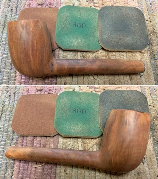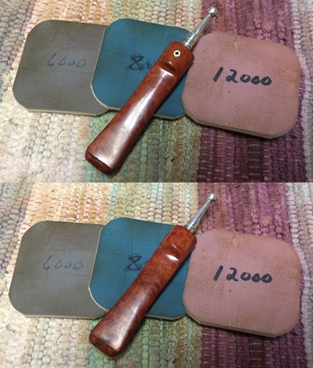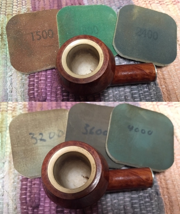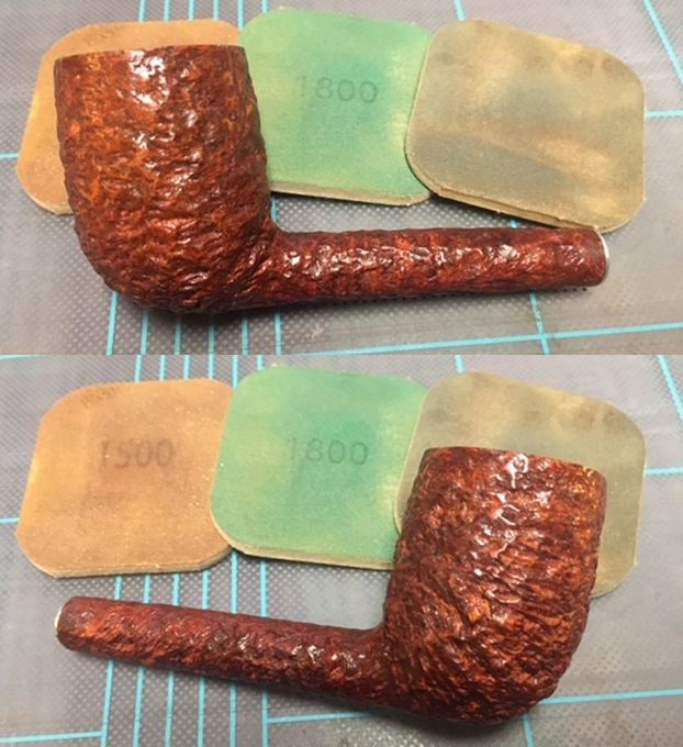 Next, I use the 1500 grade micromesh pad and lightly sand over the Burl surface. The aim is to ‘scalp’ the peaks of the mountain tops on the craggy surface to lighten them. The lightening of the peaks creates more contrast and depth definition to the landscape. I follow the scalp sanding by running the Dremel’s buffing wheel over the surface again. This, I believe, achieves the ‘2-toned’ look of Kaywoodie’s design for the ‘Natural Burl’ line.