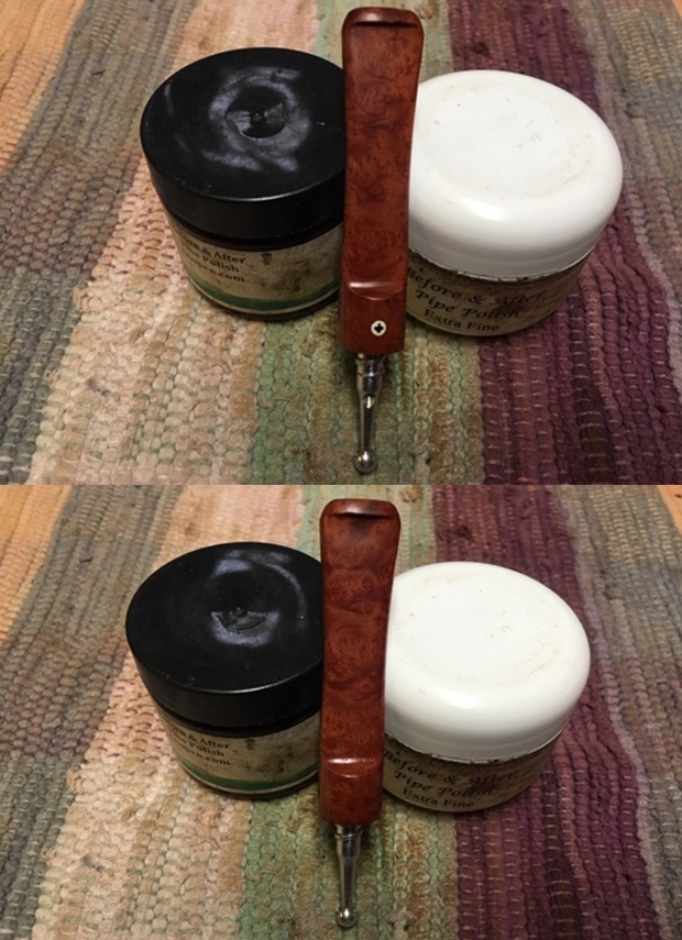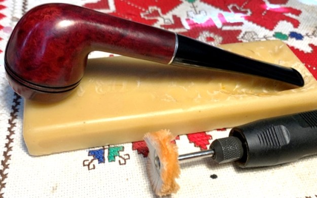 In the homestretch – next, I mount another buffing wheel onto the Dremel setting the speed at about 40% full power. After reuniting the Kaywoodie’s stem and stummel, Blue Diamond compound is applied to the rim and smooth briar surface on the underside and end of the shank. The compound is also applied to the stem. After applying the Blue Diamond compound, the pipe is buffed with a felt cloth to remove the compound dust from the areas on the stummel and from the stem. Next, another cotton cloth buffing wheel is mounted and set at the same speed and carnauba wax is applied to the entire pipe. I’m careful to apply with a very light touch of wax to the Natural Burl surface not to allow wax to build up in the crannies. Wax is applied to both stummel and stem and then the pipe receives a rigorous hand buffing with a microfiber cloth to raise the shine.
