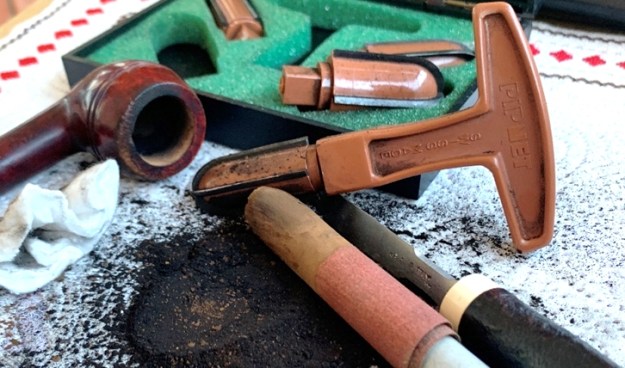 Next, I turn the attention to the stummel. I begin by reaming the Kaywoodie’s chamber to remove the cake. Using the Pipnet Reaming Kit, I use two of the four blade heads available in the Kit. I don’t know how long this cake has been waiting to be removed, but it is as hard as a brick. I’m careful not to force the blades beyond their torque endurance level – simply allowing the scraping action to wear away the brick cake. When both blades do what they can, the Savinelli Fitsall Tool continues the scraping of the chamber walls. Finally, to remove the last remaining carbon remnants, a 240 grade sanding paper is wrapped around a Sharpie Pen to sand the chamber getting down to fresh briar.