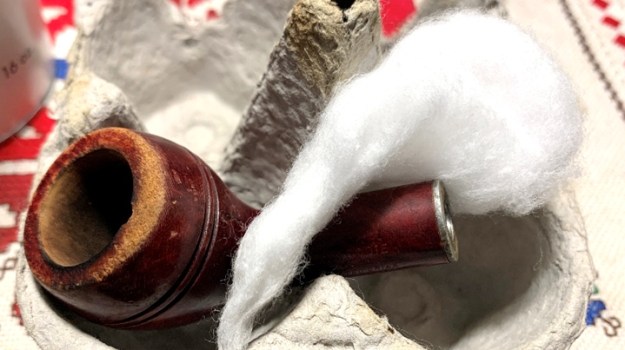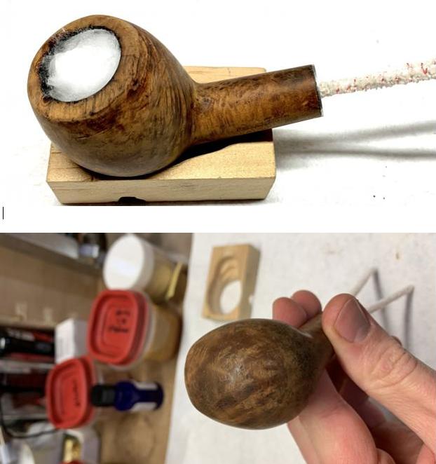 I put a stop on sanding and further cleaning the rim because the hour is late, and through the night I want to use a kosher salt and alcohol soak to advance the cleaning of the internals of the stummel. I first fashion a cotton ball into a ‘wick’ by pulling and twisting it. It is then inserted down the mortise into the airway with the help of a stiff wire. The wick helps to draw out the latent residue of tars and oils.