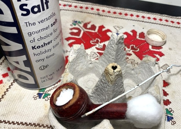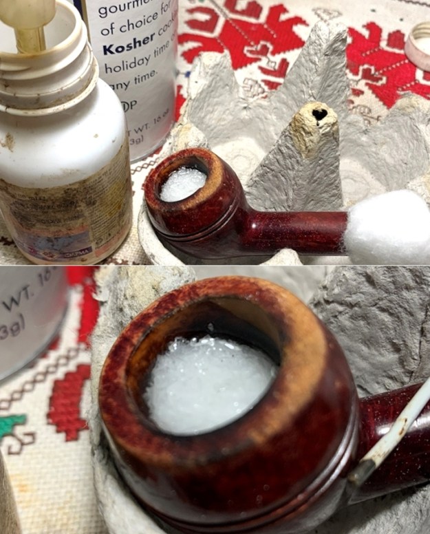 The bowl is then filled with kosher salt, which leaves no aftertaste as with regular iodized salt. After placing it in the egg carton to keep it stable, I then fill the chamber with isopropyl 95% until it surfaces over the salt. After a few minutes, as the alcohol is drawn into the stummel, the alcohol is topped off and it is set aside to work through the night.
