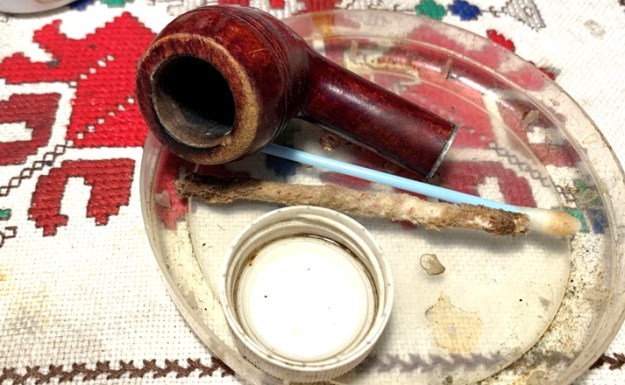 After a few hours, the Kaywoodie’s stem is extracted from the Deoxidizer and after draining, I squeegee the liquid off the stem with my fingers. I then run a pipe cleaner wetted with isopropyl 95% through the airway to clear the Deoxidizer. Using a cotton pad and alcohol, the stem is wiped to remove the raised oxidation resulting from the soak.