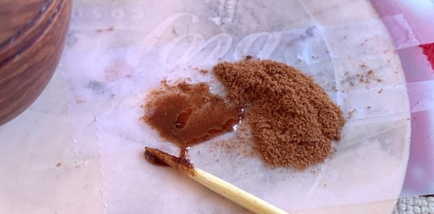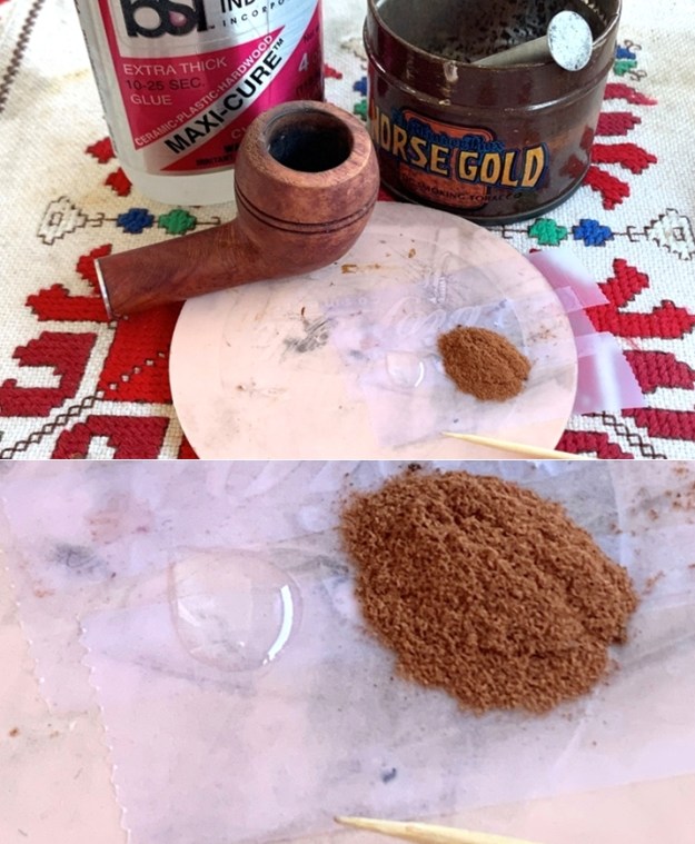 I place a small mound of briar dust on the mixing palette that I’ve covered with scotch tape for ease of cleaning. Next to the briar dust a small amount of BCI Extra Thick CA glue is puddled.