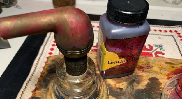 Therefore, I stop the micromesh process mid-stream and plan to insert Steve’s approach to provide an undercoat and see how it goes!  Regarding the question of the use of black or dark brown for the undercoat, Steve saw no difference in the two.  I understand why now – the point of an undercoat is to darken the grain threads for the most part and in his approach, the undercoat is, in large measure, removed but for these effects.  I decide to apply Fiebing’s Dark Brown Leather Dye as the undercoat.  I assemble on my desktop the needed components.  With spring in full swing here in Sofia, I’m working on my 10th floor Man Cave balcony and enjoying the views while I work.  To begin, after wiping the bowl with alcohol to clean it, I warm the stummel with a hot air gun (inside again for a few minutes).  This warms the briar with the result of opening the grain to be more receptive to the dye.  Then, back on the Man Cave, I use a folded pipe cleaner to paint the aniline dye onto sections of the briar surface.  While still wet, the lit candle ‘flames’ the dye.  The flame combusts the alcohol in the dye leaving behind pigmentation in the grain.  I cycle around the bowl painting and flaming twice to make sure the coverage is thorough.  I then put the stummel aside for the initial undercoat to dry.  The following pictures show the dense appearance of the flamed surface.Turning now to the stem, there is very little chatter on the bit. The lower side pictured in the second picture only has a small button compression that I will address.Deep oxidation is still hanging on especially on the shank side of the stem.  The lighter exposure of the picture helps to show what I can see with the naked eye.To address the lower bit button compression, I use the heating method of expanding the vulcanite, a rubber compound.  With the flame of a Bic lighter, the bit is painted and as the vulcanite heats, the dent hopefully reclaims lost territory.  The result is good.  Only sanding will be necessary.The flat needle file is used to freshen the button and 240 grade paper sands the bit, and the minor chatter is erased.I expand the 240 sanding to the entire stem to address the latent oxidation.  I do not relish the thought of the oxidation emerging during the later polishing stages.  I use a plastic disk I fabricated for this purpose that I pinch up against the stem facing to guard against shouldering the edge of the stem.  The disk works well to maintain a crisp facing.Next, the entire stem is wet sanded with 600 grade paper followed by an application of 000 grade steel wool.  The 3-hole stinger also receives attention from the steel wool.The stem is now ready for the full regimen of micromesh pads beginning with wet sanding using pads 1500 to 2400 and followed by dry sanding with pads 3200 to 4000 and 6000 to 12000.  Between each set of 3 pads, Obsidian oil is applied to condition the stem and to guard against future oxidation setting in.  The Kaywoodie “500” stem looks great. Turning again to the stummel, per Steve’s description I use 430 grade paper to sand off the dried excess undercoat.I combine the sanding with wiping the stummel with a cotton pad wetted with alcohol.  This helps to remove the excess and to allow the grain to come through more.At this point I transition to applying the full regimen of micromesh pads from 1500 to 12000 in 3 pad increments – 1500 to 2400, 3200 to 4000, and 6000 to 12000.  The point of the undercoat is darkening and giving greater definition to the grain.  The progression of the micromesh process shows this to be the case. Next is the overcoat staining with the new red aniline dye I acquired.  I’m hoping to get close to the Kaywoodie “500” red finish hue.  I used Fiebing’s Oxblood as the overcoat last time.  I approach this overcoat stain as if it were the first coat.I begin by heating the stummel with the hot air gun to open the briar’s receptivity to the dye.Next, using a folded pipe cleaner, I paint the red dye on the stummel.  I discover at the first attempt to flame the dye with the lit candle, that there wasn’t enough alcohol content in it to combust.  The application of the dye transitioned into a dye wash – hmm.  I paint the dye on to get a thorough coverage.  I repeat the process once more to make sure all was covered well with the dye. Afterwards, I set the dye aside to dry.  I’m a bit concerned at this point that the red dye may not have enough resonance or depth in it.  It seems to light or pale at this point.I decide to unwrap the finish using Blue Diamond compound and a cotton cloth buffing wheel on the Dremel.  The Dremel is set at about 40% full power.After removing the dye excess my concerns were confirmed.  The new red dye mixture that I used was not ‘grabbed’ by the grain to create much of a red tent over the dark brown undercoating.  I take a quick picture on the black cloth I normally use for the finish shots at the end of the restoration to see what the camera might see.  The finish looks great – the grain looks great, but the color of the Kaywoodie “500” is falling short of expectations. Last time I worked on Paw’s other Kaywoodie “500”, I used an Oxblood over dark brown and it turned out well.  I know my processes have changed up somewhat, but I have a foundation of dark brown undercoating that has been brought down to a darkened grain presentation.  On top of that, the red dye added something… and now, Fiebing’s aniline Oxblood Leather Dye on top of that.  The only thing I do to prepare the surface for the Oxblood is to wipe it well with a cotton pad wetted with alcohol.  Interestingly, almost no dye residue came off after the red wash.  Now using Fiebing’s Oxblood, I apply the dye, flame it, and set the stummel aside to rest for several hours – overnight.  Even at this ‘raw’ state, I can see a marked difference in the dye’s resonance.The next mornin