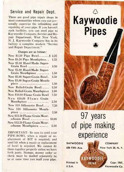 Armed with this dating information, I look through the old Kaywoodie catalogs and flyers from the jpeg repository of the defunct Chris Keene’s, ‘PipePages’ website.  This poking and digging proved helpful! I find a ‘Kaywoodie Pipes’ flyer dated 1947 – the correct period.  It contains Flame Grain listings for both briar and Meerschaum lined pipes.   I found interesting also in the front/back panels below are the charges for repairs and replacement parts Kaywoodie was asking in 1947!  This next page of the flyer shows the Flame Grain offerings with the briars marked with a $10 price tag. Curious about what that Kaywoodie might do to my pocket book new today, I went to a site that computes the value of $10 in 1947 to the value it would have today. Amazingly, in 1947 $10 would have the purchasing power of $116.80 today according to this site!  I would consider this a high-end pipe!  The Flame Grain Apple example below also carries the cloverleaf logo on the top of the stem like our Pear.