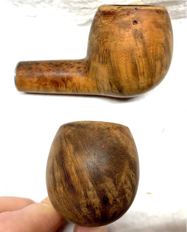 The nomenclature is on the underside of the shank’s smooth briar panel with ‘KAYWOODIE’ (as most of it is not legible as the upper half of ‘Kaywoodie’ bleeds into the craggy rusticated landscape) [over] ‘Natural Burl’ in fancy cursive script.