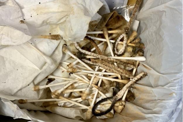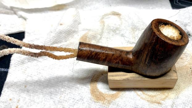 I started by reaming the pipe. The bowl is large. So, it took a lot of reaming to get clean. The outside was extremely dirty. So, I cleaned the pipe 4 or 5 times with Murphy’s Oil Soap. I really soaked the rim well to try to soften the lava. It took a ton of scrubbing and a little work with a knife, but I was able to get most of it off and remove a lot of the burn marks on the shank. Unfortunately, this revealed a great deal of damage to the rim. There were also multiple fills, and I even had to remove a protruding grain of sand from the briar. To repair the damage to the rim, I carefully sanded back the damaged areas on a topping board, careful not to change the shape of the rim. I put a dab of Vaseline on the logo to protect it, then soaked the stem in an oxyclean bath. This would help loosen up all the gunk inside and make it easier to clean the oxidation off the outside. I also filled the bowl with cotton balls, stuck pipe cleaners in the shank, and then used a syringe to fill the bowl with alcohol to help remove any ghosting in the pipe, as well as loosen up any remaining cake inside the bowl to make it easier to clean.   After I got the stem out of the oxy bath, it revealed a lot of oxidation that would need to be cleaned up. The internals of the stem were also gooped up, but I was able to now force a pipe cleaner through it. I cleaned much of the surface oxidation with a Magic Eraser, then moved on to the internals.I sanded the stem with 600, 800, 1000, then moved into micro mesh pads from 1200 – 12000. Once finished, I oiled the stem with Obsidian Stem Oil and let it soak in. I turned my attention back to the bowl and did my best to clean out the inside of the shank and bowl with Q Tips and Pipe Cleaners soaked in alcohol. Then I set it aside for day 1.