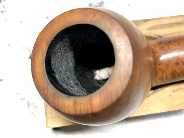 Cleaning the shank and the stem took A LOT of pipe cleaners and Q Tips… After letting the pipe dry over night, I was able to see more clearly the inside and outside of the pipe. No surprise with how burned the outside of the pipe was that there were also heat fissures inside the bowl. I inspected them carefully and gauged their depth with dental picks. They, luckily, were not too deep. I was also now able to see some of the fills, scratches, and sand pits better on the outside of the bowl. I used a wet rag and a hot iron to try to raise them a bit. Then I carefully cleaned them out with my dental picks. At this point, I got a little ahead of myself as I focused on cleaning out the pits. I moved on to filling the pits and scratches with CA glue before fully stripping the finish. After the glue cured, I sanded down the glue spots. Then I wiped the entire stummel down with high-proof alcohol followed by acetone to really remove the finish. Since I did my steps slightly out of order, the CA glue had softened in a couple of the fills. So, I picked it out and refilled it. I let the glue cure and then sanded the entire stummel. I had to be very careful over the stamping to preserve it. With the finish removed and the stummel sanded, I placed a wine cork in the bowl and coated it with dye.It’s hard to tell in the pictures, but the dye came out a little too dark, more similar to a Flame Grain. To keep it authentic with a Super Grain, I needed to lighten it back up a bit. I lightly sanded it with my sequence of micromesh pads which also brought the shine back. After the stummel was sanded, the color was nearly perfect. I then buffed it using Tripoli, followed by White Diamond, and finally Carnauba. Now that the outside was finished, I moved on to the inside. After really inspecting the fissures, some of them were deeper than I would like. If it was my pipe, I would have done a bowl coating and just kept an eye on them to address later, but since this pipe was for someone else, I wanted to address it now. This way they won’t have to deal with it down the road. I mixed up some JB Weld, which dries inert and can handle the heat. I carefully stuck it only into the fissures, using as little as possible so as not to coat the briar, since JB Weld won’t breathe like briar.After it cured, I sanded down the JB Weld to make the bowl smooth and flush, as well as to remove any that was not inside the fissures.Then I coated the bowl with activated charcoal in a great method I learned from Dad’s Pipes. (https://dadspipes.com/2015/08/12/a-simple-effective-bowl-coating/)After cleaning the charcoal off the rim, I noticed it had dulled a little bit. So, I threw the buffing wheel back on and gave it another coat of Carnauba. The pipe was now complete! I hope it will bring its new owner joy for many years!