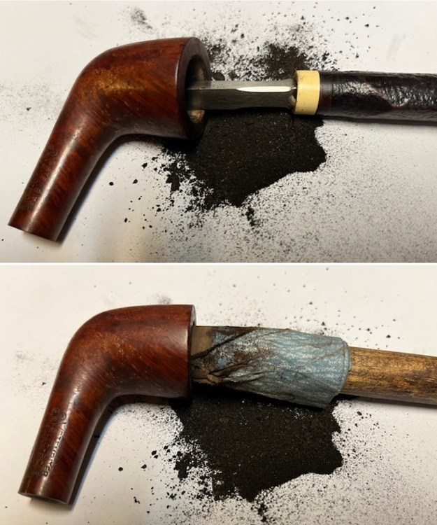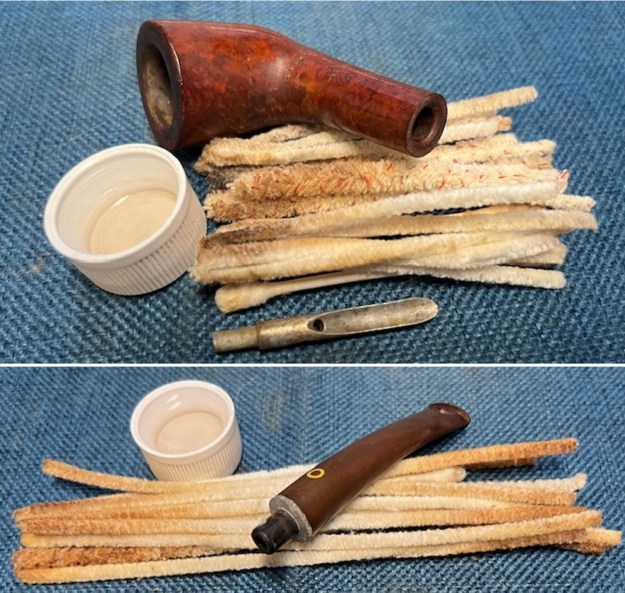 I heated the spade style stinger with a lighter flame and once it heated the tars that held it in place let loose and I was able to remove it. I cleaned up the aluminum stinger with alcohol and a 320 grit sanding pad to remove the debris. I set the stinger aside and then I cleaned out the shank, mortise and the airway in the bowl and the stem with pipe cleaners (both smooth and bristle), cotton swabs and 99% isopropyl alcohol. It took a lot of cleaners but I got the grime and oils out of the shank and stem. The pipe smelled of tobacco it was much cleaner smelling than previous to that.