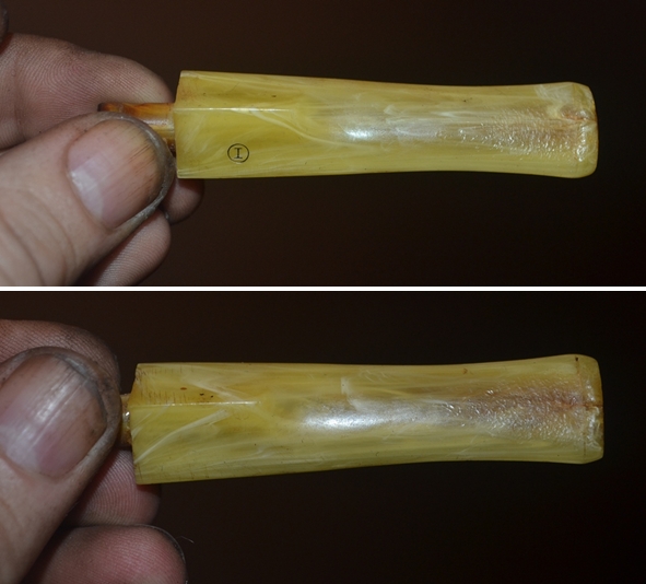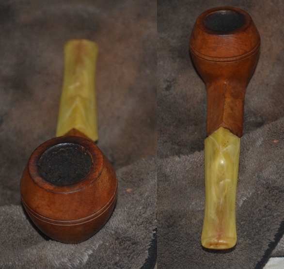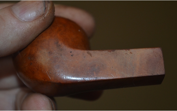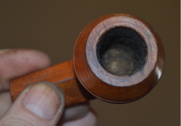 Moving on to the chamber, I was startled when most of the cake crumbled from the walls with a couple of turns of the reamer. Still more shocking was the sudden appearance of a thin coat of the original yellow product of honey curing. I knew I had a rare find and wondered at the short-term but intense enjoyment of the pipe that could have led to more than average cake but left the prominent yellowing intact. The rest of the cake came clean with gentle 400-grit sanding.