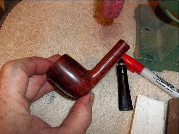 Staying with the 400-grit paper to remove scratches and dings on the beautiful briar, I lightened the color still more and found a few fills and other grain flaws that accounted for why this finely shaped bulldog didn’t end up with, say, a Kaywoodie stamp.