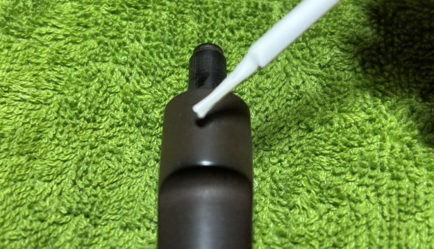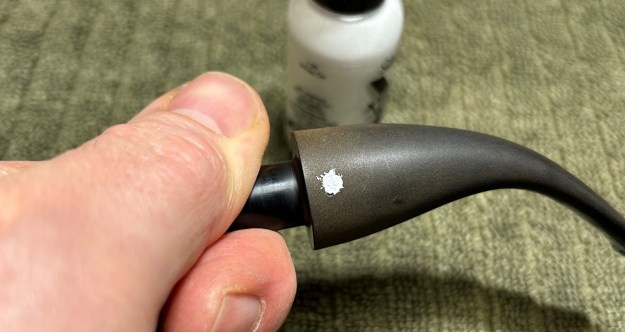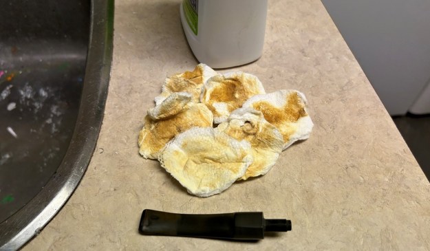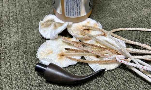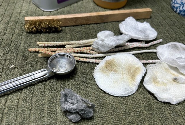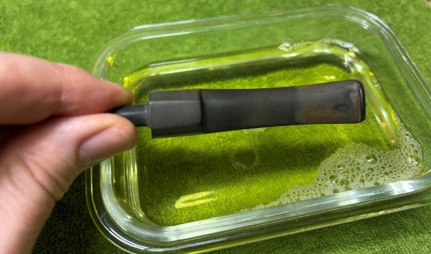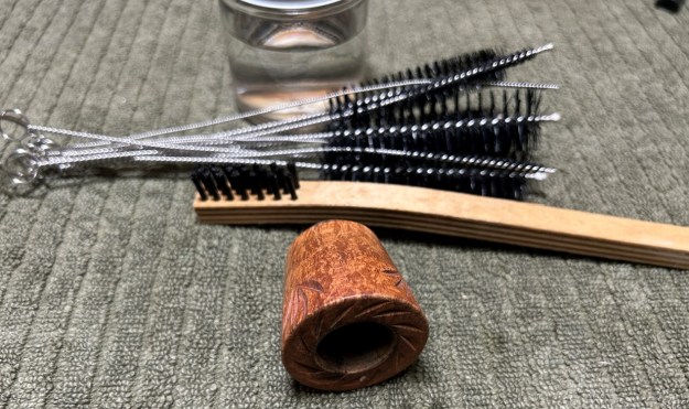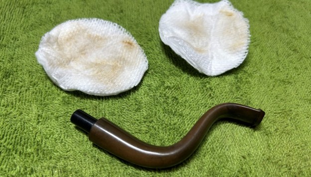 I then moved on to the metal body of the pipe (including the acrylic stem, which is attached). It didn’t initially look dirty, but took a surprising amount of elbow grease to clean! I disinfected the inside and outside of the pipe with both pipe cleaners and cotton swabs dipped in lemon-infused 99% isopropyl alcohol. I scrubbed thoroughly. I also used a wire brush to scrub some of the more stubborn areas.