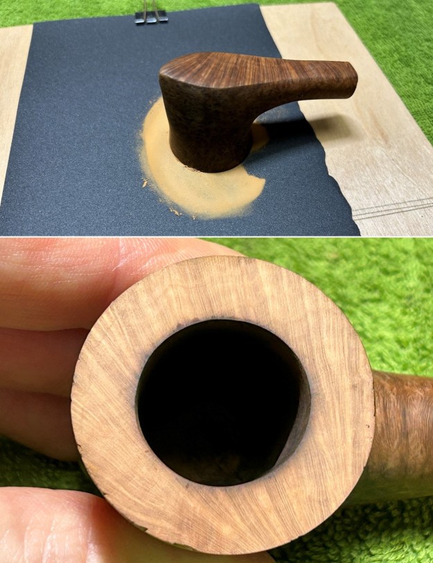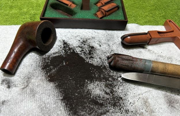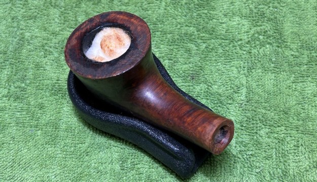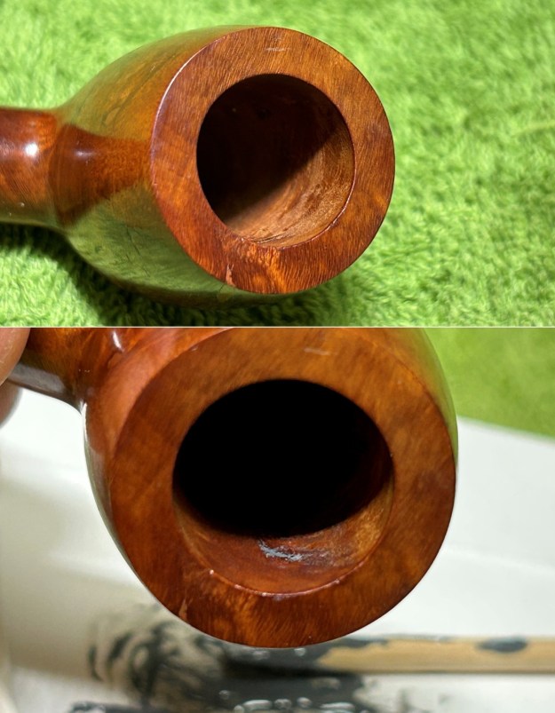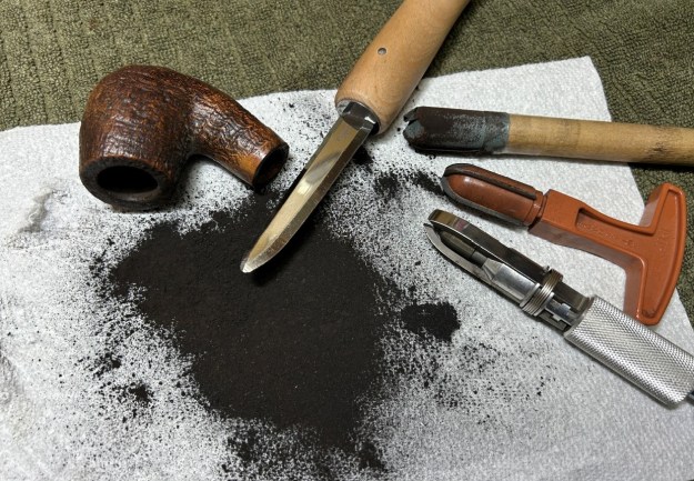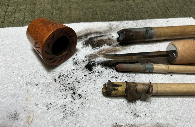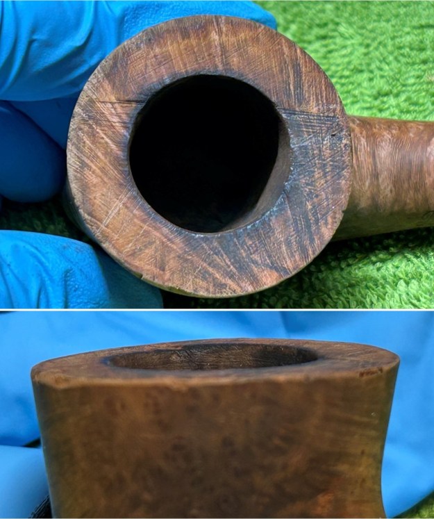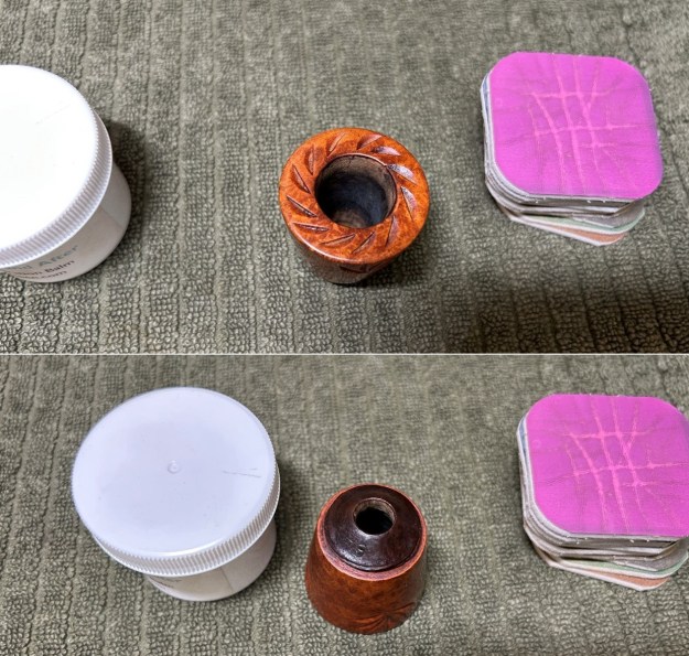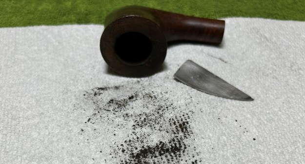I started on the bowl. The first step was to ream it out – that is to say, remove all the cake inside the bowl. This accomplished a couple of things. First (and most obviously), it cleaned the bowl and provided a refurbished chamber for future smoking. Second, when the old cake was removed, I could inspect the interior walls of the bowl and determine if there was damage or not. Fortunately, there was none. As the cake was light, I used a pipe knife, and a piece of sandpaper taped to several sizes of wooden dowel. Collectively, these ensured that all the debris was removed.