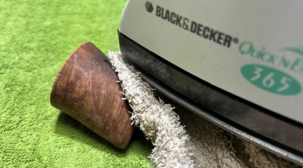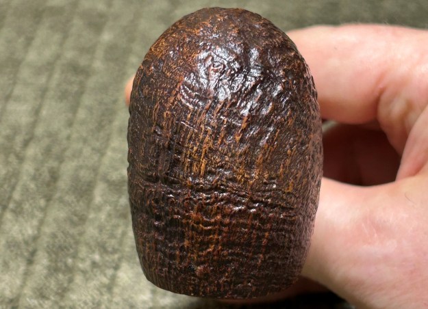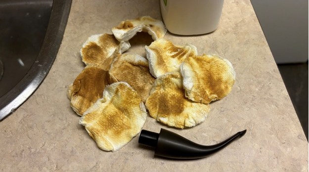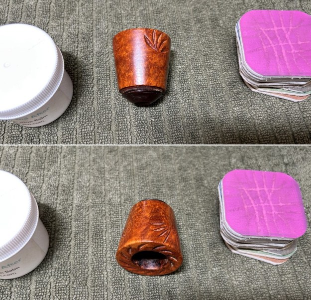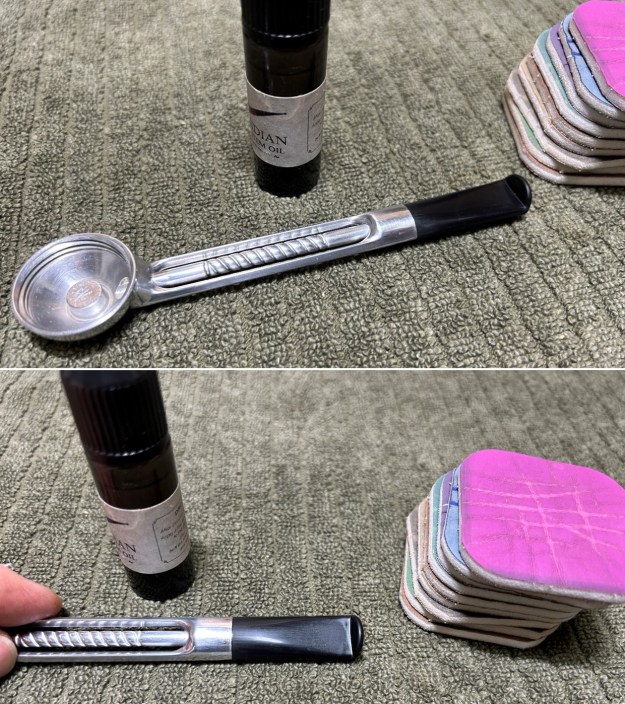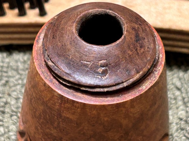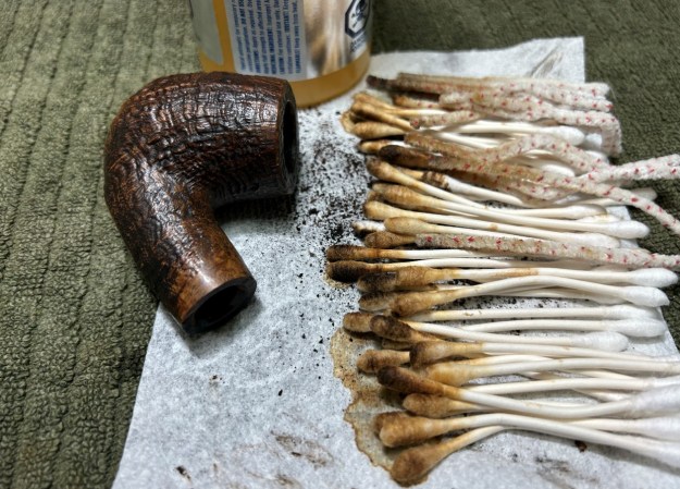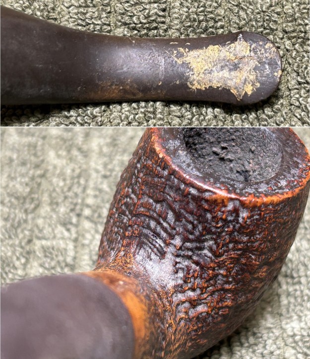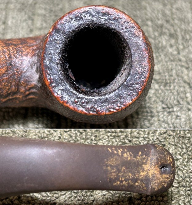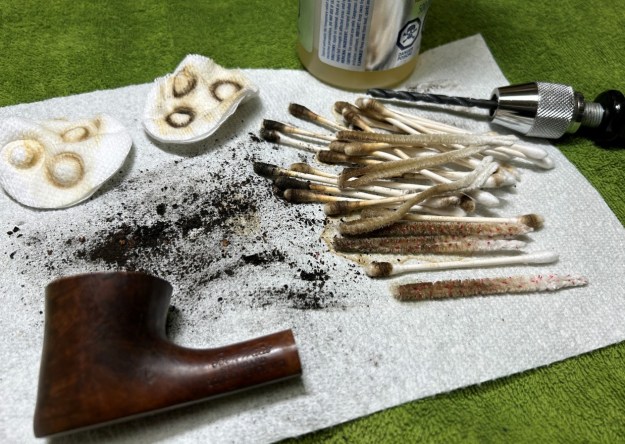 I started on the bowl. The first step was to ream it out – that is to say, remove all the cake inside the bowl. This accomplished a couple of things. First (and most obviously), it cleaned the bowl and provided a refurbished chamber for future smoking. Second, when the old cake was removed, I could inspect the interior walls of the bowl and determine if there was damage or not. Fortunately, there was none. As the cake was light, I used a pipe knife, and a piece of sandpaper taped to several sizes of wooden dowel. Collectively, these ensured that all the debris was removed.