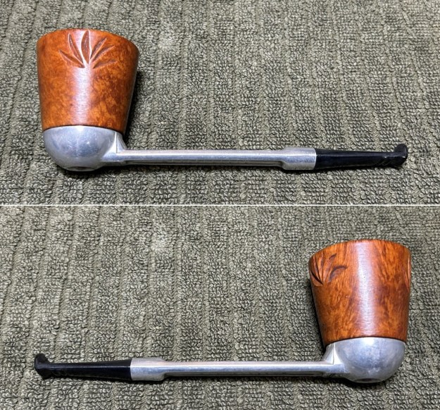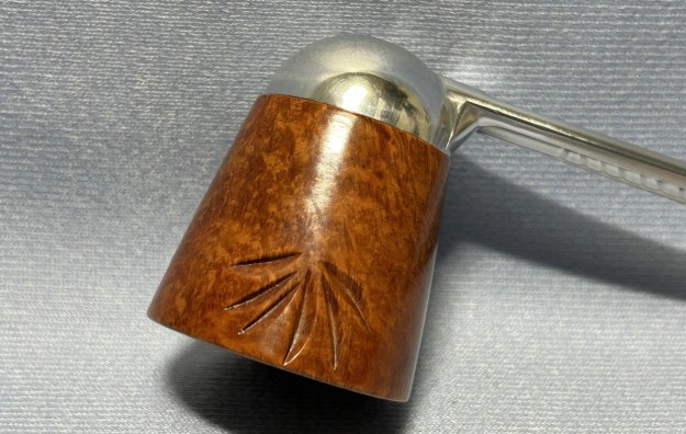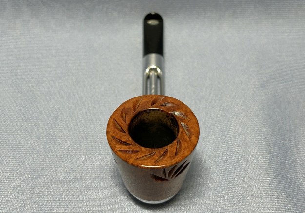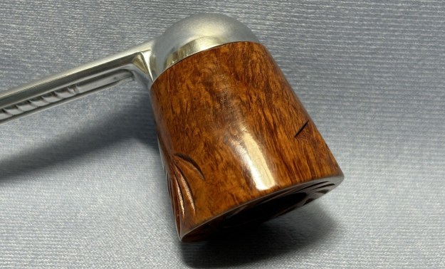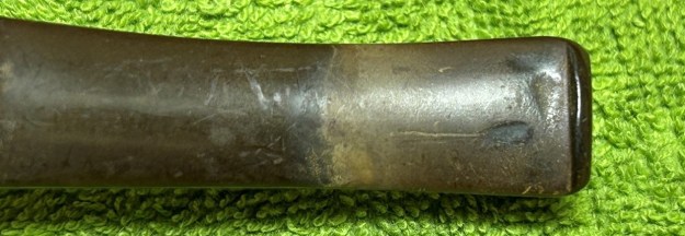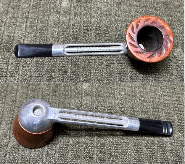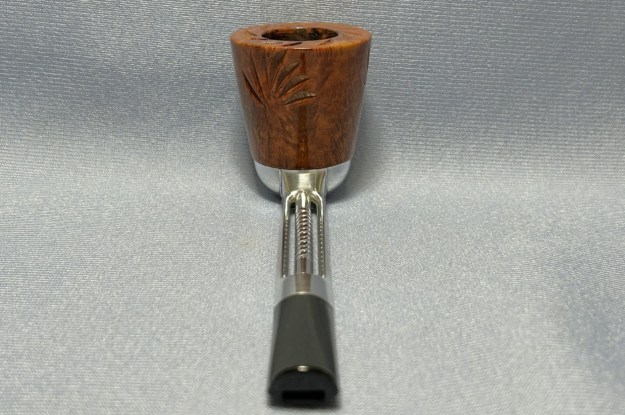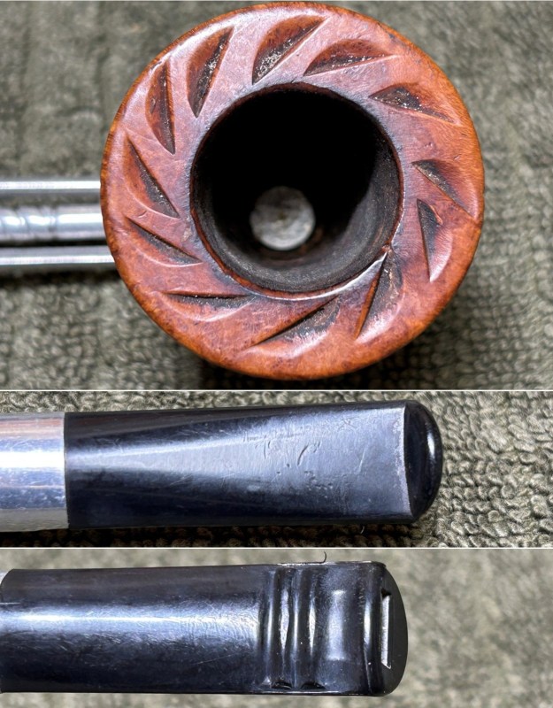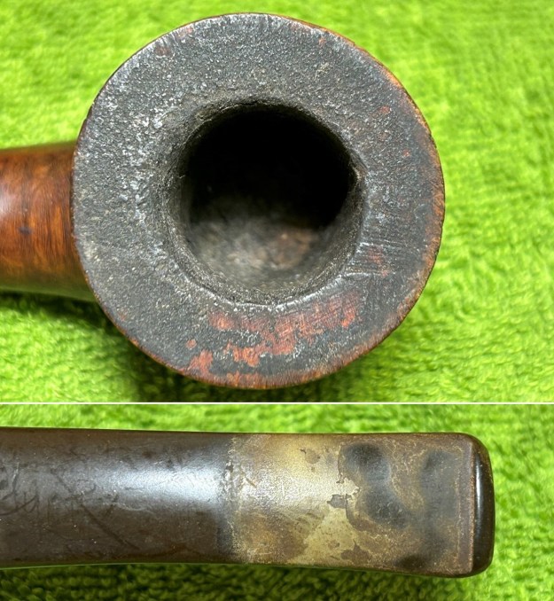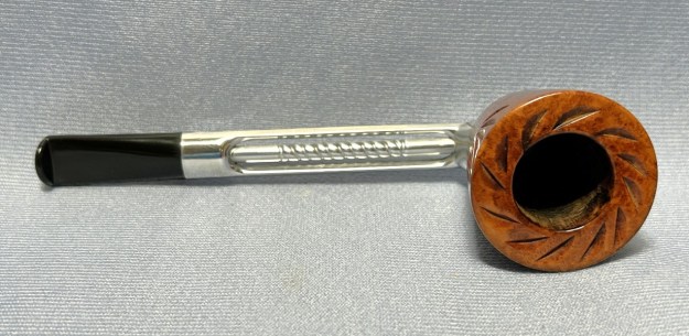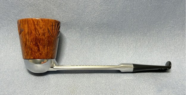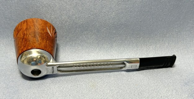 Let’s have a look at the marks. On the underside of the bowl, engraved in the metal, is the word Falcon. Also engraved, inside the centre circle, is the shape number 7. At the opposite end of the shank, near the stem, is engraved the letter D. The number 7 is the mould number from the factory and the D indicates that this pipe has a dental bit (as previously mentioned). The lack of a country-of-origin mark indicates that this one was made in the USA.