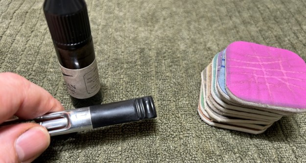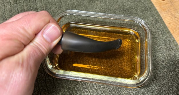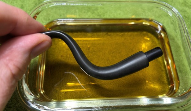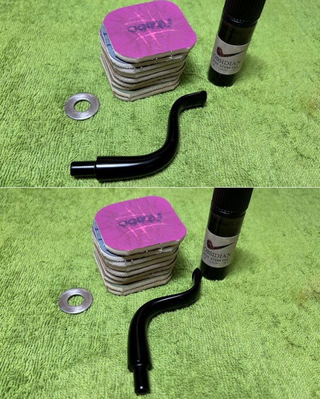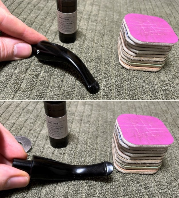 Following that, I used all nine of the micromesh sanding pads (1,500 through 12,000 grit) to sand out flaws in the stem, even out the acrylic, and provide gentle polishing of the finished surface. I also applied pipe-stem oil while using the last five micromesh pads. There was a wonderful, deep black shine to the stem when I was done.