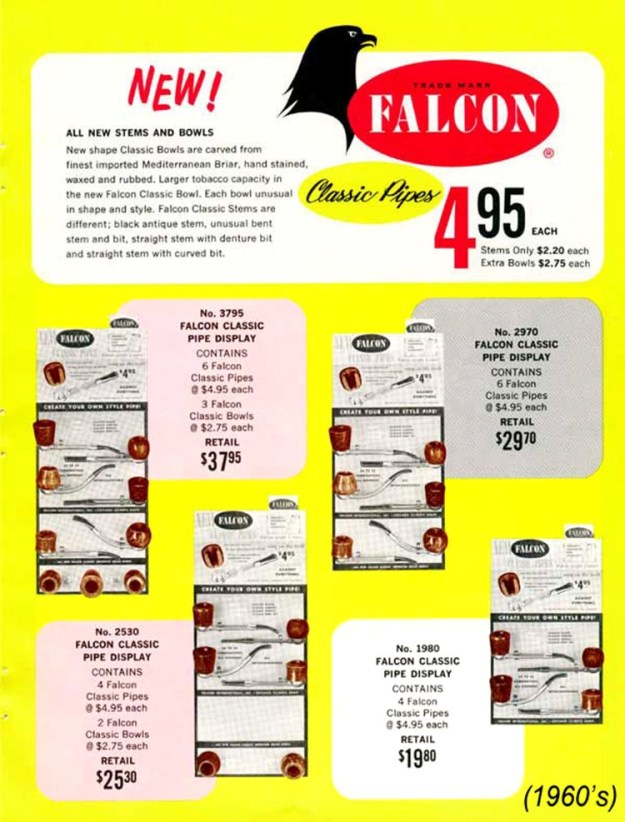 The Falcon pipe was created in 1936 by the American engineer Kenly Bugg. However during WWII the production of the Falcon was limited. In 1949 George Hunt took over production and marketing and by 1954 6 million Falcon pipes had been sold in the U.S.A. By 1961 production started in England. In 1964 the Alco was launched. In 1967 the Brentford was launched but in 1979 it was withdrawn from the market. In 1968 production of the Falcon in Chicago, U.S.A. stopped. The Falcon International was introduced in 1977, which featured a removable mouth piece and filter.