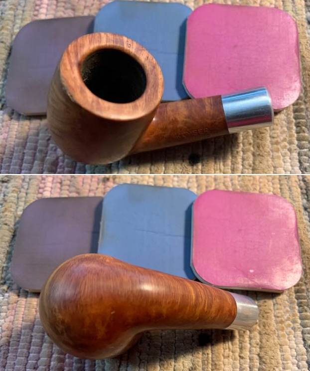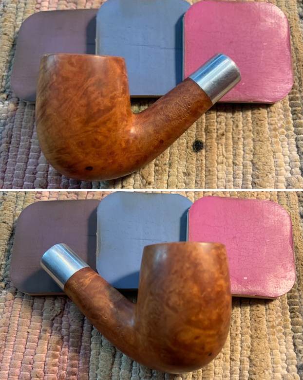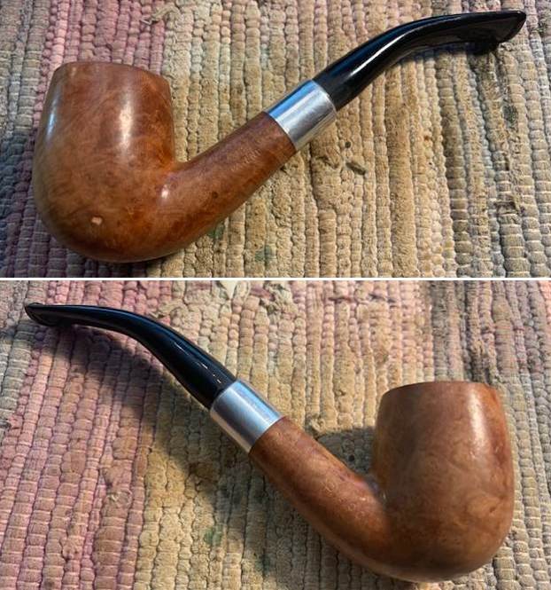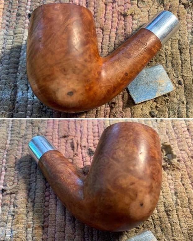 I carefully polished stem with Blue Diamond to polish out the remaining small scratches. I used a very light touch so as not to damage the stem. I buffed the bowl with Blue Diamond as well – a bit more vigorously. I gave the bowl and the stem multiple coats of carnauba wax. I buffed the pipe with a clean buffing pad to raise the shine. I hand buffed it with a microfiber cloth to deepen the shine. The pipe polished up pretty nicely. The grain came alive with the buffing and works well with the polished aluminum ferrule and the polished black vulcanite stem. Altogether the pipe has a rich look. The finished pipe is shown in the photos below. The shape, finish and flow of the pipe and stem are very well done. The dimensions are Length: 5 ½ inches, Height: 1 ¾ inches, Outside diameter of the bowl: 1 ¼ inches, Chamber diameter: ¾ of an inch. The weight of the pipe is 1.55 ounces/44 grams. I will be gifting this pipe to a good friend of mine who I think will appreciate cool smoke the pipe delivers. Thanks for walking through the restoration with me as I worked over this well-made Keyser Hygienic Bent Billiard Patent pipe.