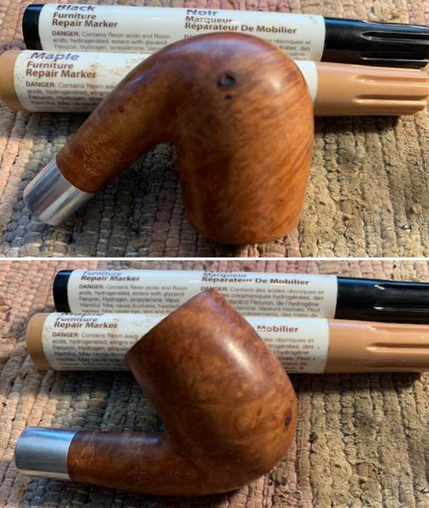 With the bowl and shank clean I moved on to repair the shrunken fills in the heel. I used the tip of a Maple and black stain pen to darken the putty spots before putting a drop of clear CA glue on top to fill them in.