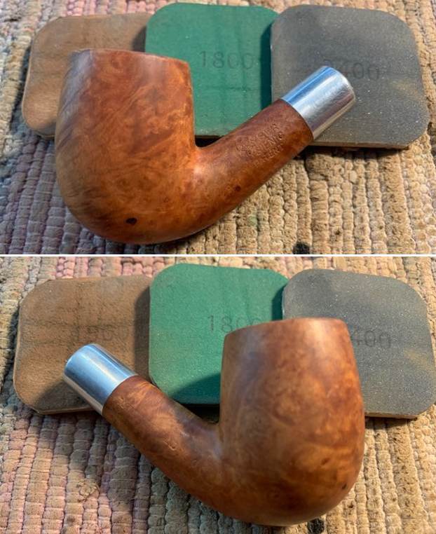 I worked some Before & After Restoration Balm into finish of the briar with my fingertips to clean, enliven and protect it. I let the balm sit for a little while and then buffed with a cotton cloth to raise the shine. The Restoration Balm really makes the grain stands out beautifully.