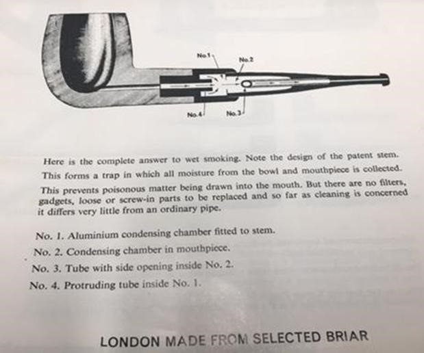 I tried to capture the “plumbing” in the shank and in the stem. The inner tube in the shank was straight and the tube in the stem was aimed downward. The mortise acted as a cooling chamber. You can also see the chip missing from the end of the stem. I also had some saved advertisements on the system that I have included below to show how it works. It is a unique pipe.