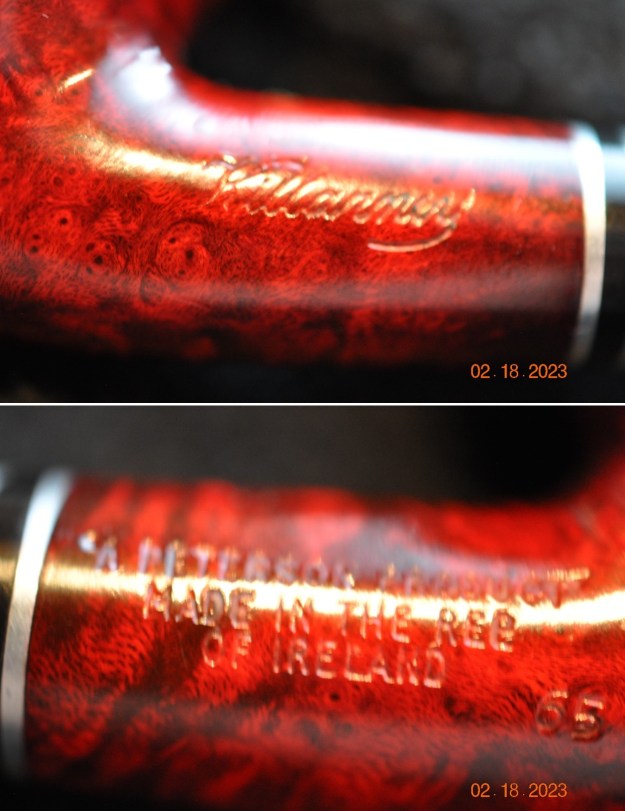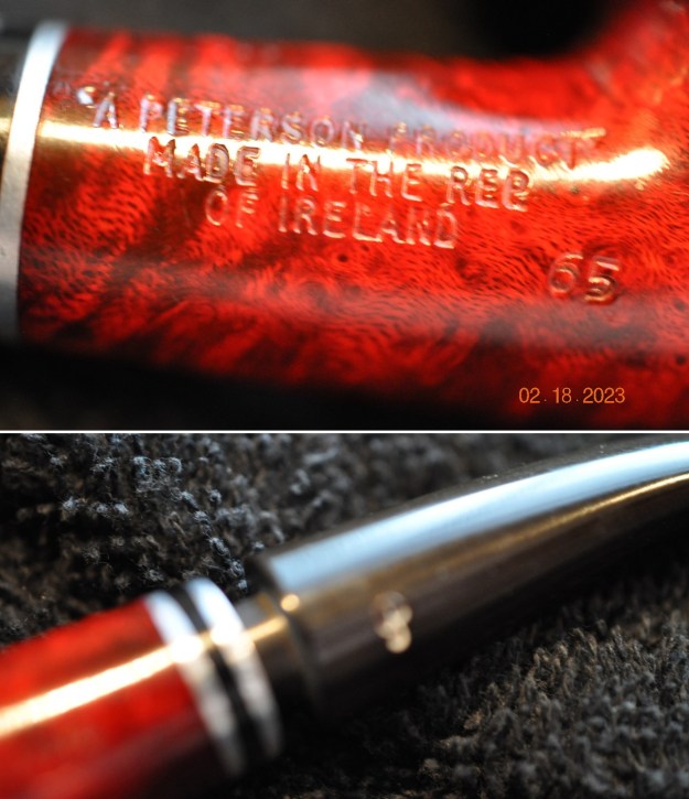 The next pipe on the work table is smaller cherry red Peterson’s Bent Billiard pipe that we purchased from and our connection in Copenhagen, Denmark on 01/26/2023. It was stamped Killarney in script on the left side of the shank. On the right it is stamped “A Peterson’s Product” [over] Made in the Rep of Ireland (in two lines) [over] the shape number 65 near the bowl/shank junction. It has a smooth, shiny red finish with great grain around the bowl and shank that is covered with a lot of oils, debris and grime. There was a thick cake in the bowl with remnants of tobacco stuck on the walls. There was a lava overflow on the rim top and edges. The top and edges of the rim were well hidden under the tars and lava. It appeared that there was a beautiful pipe underneath all of the buildup of years of use. The stem was a Peterson’s style Fishtail stem that did not fit fully against the shank. There was a gap and the stem would not fit snug. It was oxidized and calcified toward the end with some tooth marks and chatter. The button edges were quite clean. Jeff took photos of the pipe before he started his cleanup work on it. Jeff took photos of the bowl and rim top to show the thick, hard cake in the bowl with remnants of tobacco stuck on the walls of the bowl. There was a lava build up on the top of the rim and the edges of the bowl. The rim top looked pretty good but it was hard to know for sure if there was damage under the thick lava. Only clean up would tell the full story. Jeff took photos of the top and underside of the stem showing the tooth chatter, scratching, calcification and oxidation on the stem surface and wear on the edges of the button. Jeff took photos of the sides and heel of the bowl to show the condition of the finish. You can see the grime around the sides of the bowl and shank. Even under the dirt and debris of the years it looked very good. Jeff took photos of the stamping on the sides of the shank. The stamping was readable as you can see from the photos. It read as noted above. I am including the information from Pipedia’s article on Peterson pipes. It is a great read in terms of the history of the brand (https://pipedia.org/wiki/Peterson).